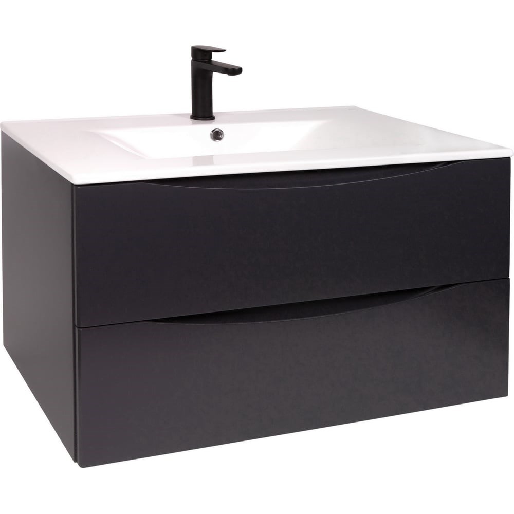 Тумба с раковиной подвесная 80см BOND Cube T01807-S05W Материал: фасад и корпус МДФ с интегрированными ручками, покрыт высококачественной премиальной краской испанского производства, цвет - графит (темно-серый) матовый. Направляющие скрытого монтажа полного выдвижения с доводчиками. Внутри ящики серого цвета. Раковина белая в комплекте: BOND S05-800.