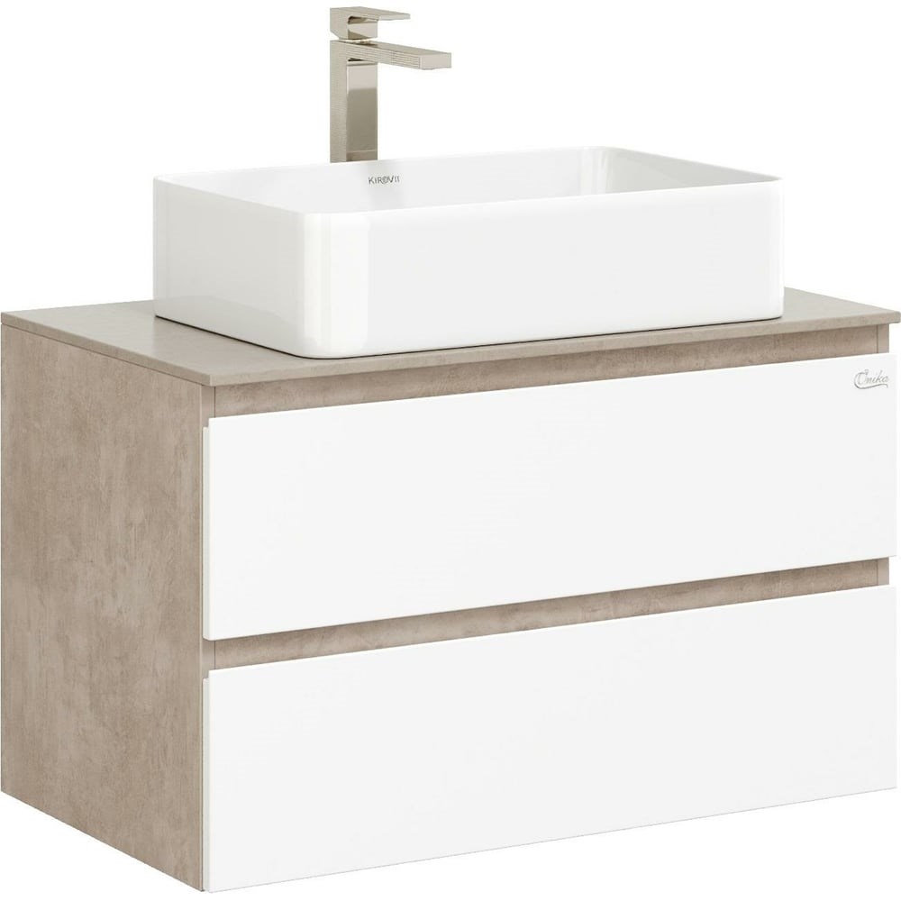 Подвесная тумба Onika Алеста 80 отражает актуальные тенденции в дизайне мебели для ванной комнаты: минимализм и геометрия фасадов, белый глянец и текстура бетонного камня, отсутствие декора, столешница из керамогранита и накладная раковина. Два ящика с направляющими скрытого монтажа с доводчиками разделены на отсеки для удобной организации косметических средств и других аксессуаров. Корпус тумбы выполнен из ЛДСП, фасад - из ЛМДФ, покрытой эмалью, устойчивых к механическим воздействиям, перепадам температур и высокой влажности. Тумба надежно крепится к стене и не занимает место на полу, не создавая при этом сложностей в уборке помещения. Подвесы для крепления тумбы - в комплекте. Размеры тумбы без учета раковины и ножек: 80x46x46 см.Размеры тумбы с учетом раковины и ножек:80х46х60 см. Гарантия на изделие 2 года. Совместимая раковина - Kirovit Олимпия 56.