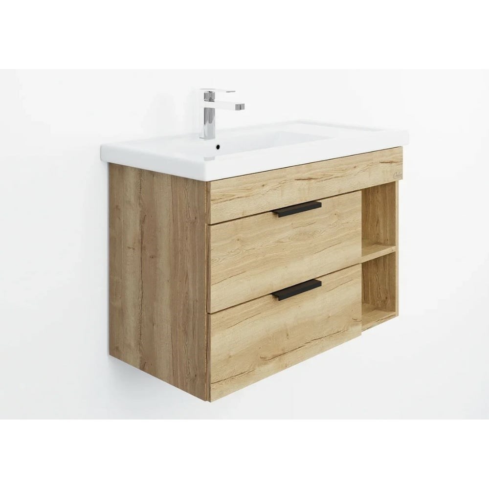 Подвесная тумба для ванной комнаты Onika Легран 80 - это сочетание насыщенного древесного декора и благородства металла: роскошная текстура и натуральный цвет дуба дают теплоту, а матовые металлические ручки добавляют урбанизма и солидности. Тумба имеет два ящика, снабженные системой плавного закрывания. Нижний предназначен для больших предметов, а верхний, имеющий удобную систему организации пространства, - для мелких аксессуаров. Две открытые полки справа от ящиков служат дополнительным пространством для хранения. Тумба выполнена из ЛДСП, устойчивой к механическим воздействиям, перепадам температур и высокой влажности, при этом она надежно крепится к стене и не занимает место на полу, не создавая при этом сложностей в уборке помещения. Ручки и подвесы для крепления тумбы - в комплекте. Размеры тумбы без учета раковины: 77х43х50 см.Размеры тумбы с учетом раковины: 81х45,5х54,5 см. Гарантия на изделие 2 года. Совместимая раковина - Kirovit Фостер 80 крыло справа.