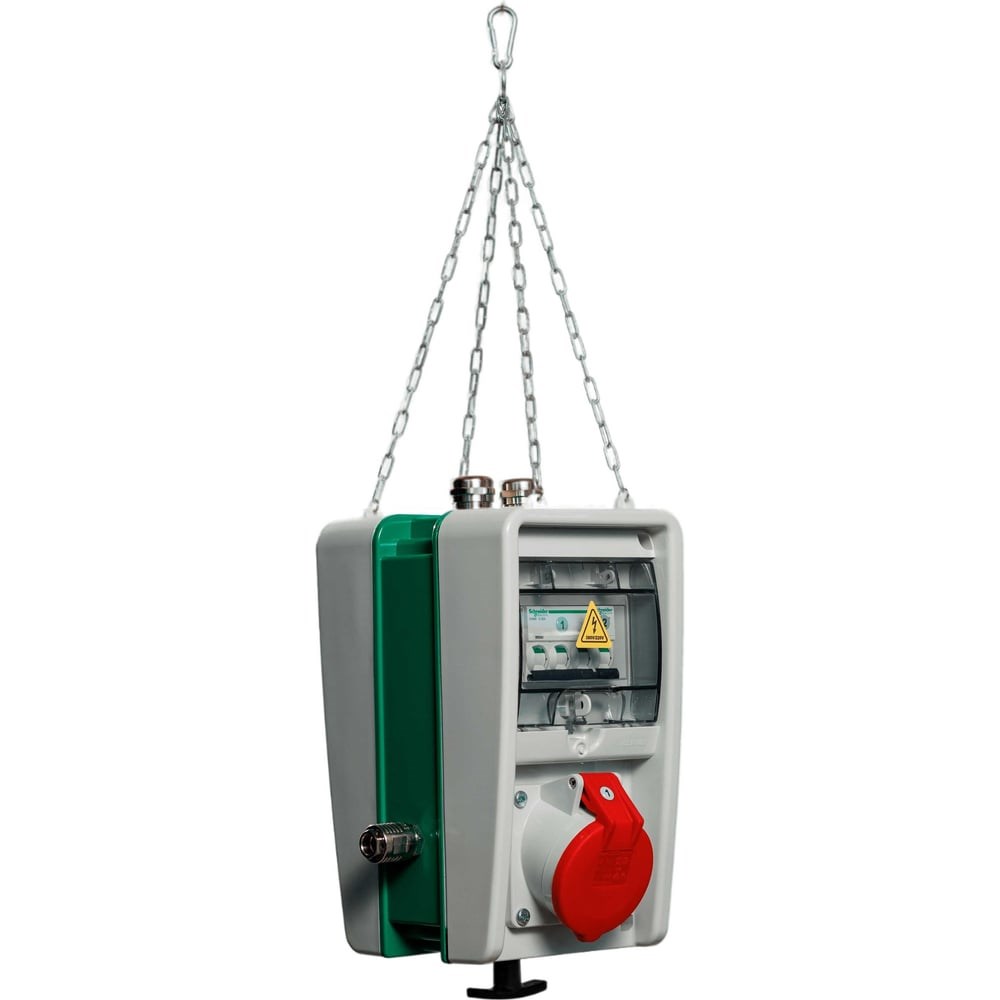 Подвесной щит EVOL комбинация розеток серии "mini partner" 0908-002-004-1 имеет размеры 300х190х150 мм. Вход: Сальник М25 - 2 шт. Выход: Фитинг рапид-мама для подключения пневмоинструмента Schuko (16A/220v/3p/IP54) - 2 шт. CEE (32A/380v/5p/IP44) - 1 шт. Защита: Авт.выкл. (16A/1,С,6kA) - 2 шт. Авт.выкл. (32A/3,С,6kA) - 1 шт.