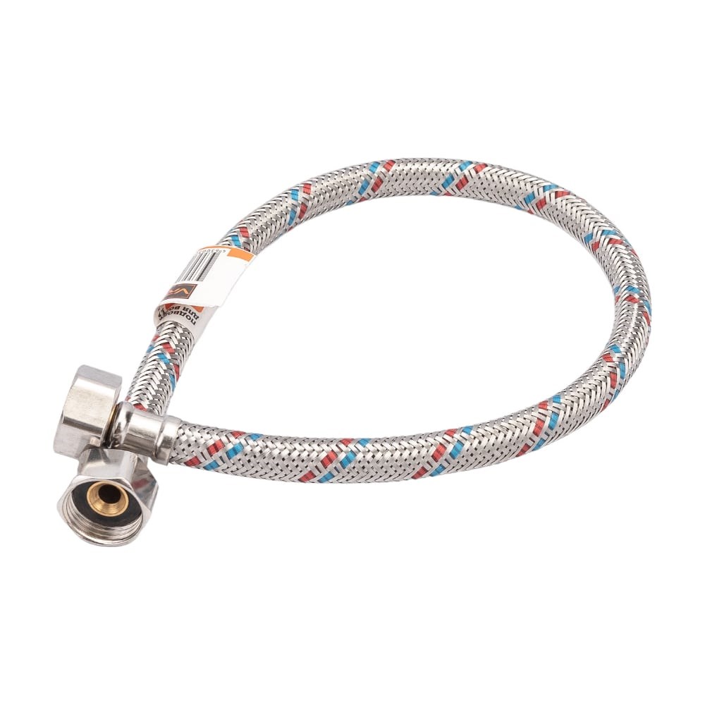 Подводка для воды 521372 предназначена для соединения сантехники с магистралью холодного или горячего водоснабжения. Подходит для металлополимерных, медных, стальных труб, для труб из сшитого полиэтилена. Применяется для подключения смесителей, стиральных машин и др. Изготовлена из качественных материалов, за счет чего отличается продолжительным сроком службы. Материал накидной гайки - нержавеющая сталь AISI 201, оплетка изготовлена из нержавеющей стали AISI 301, рукава - резина EPDM, оплетена нержавеющей проволокой AISI 301. Внимание, изображение товара может отличаться от реального! Верные параметры указаны в технических характеристиках товара.