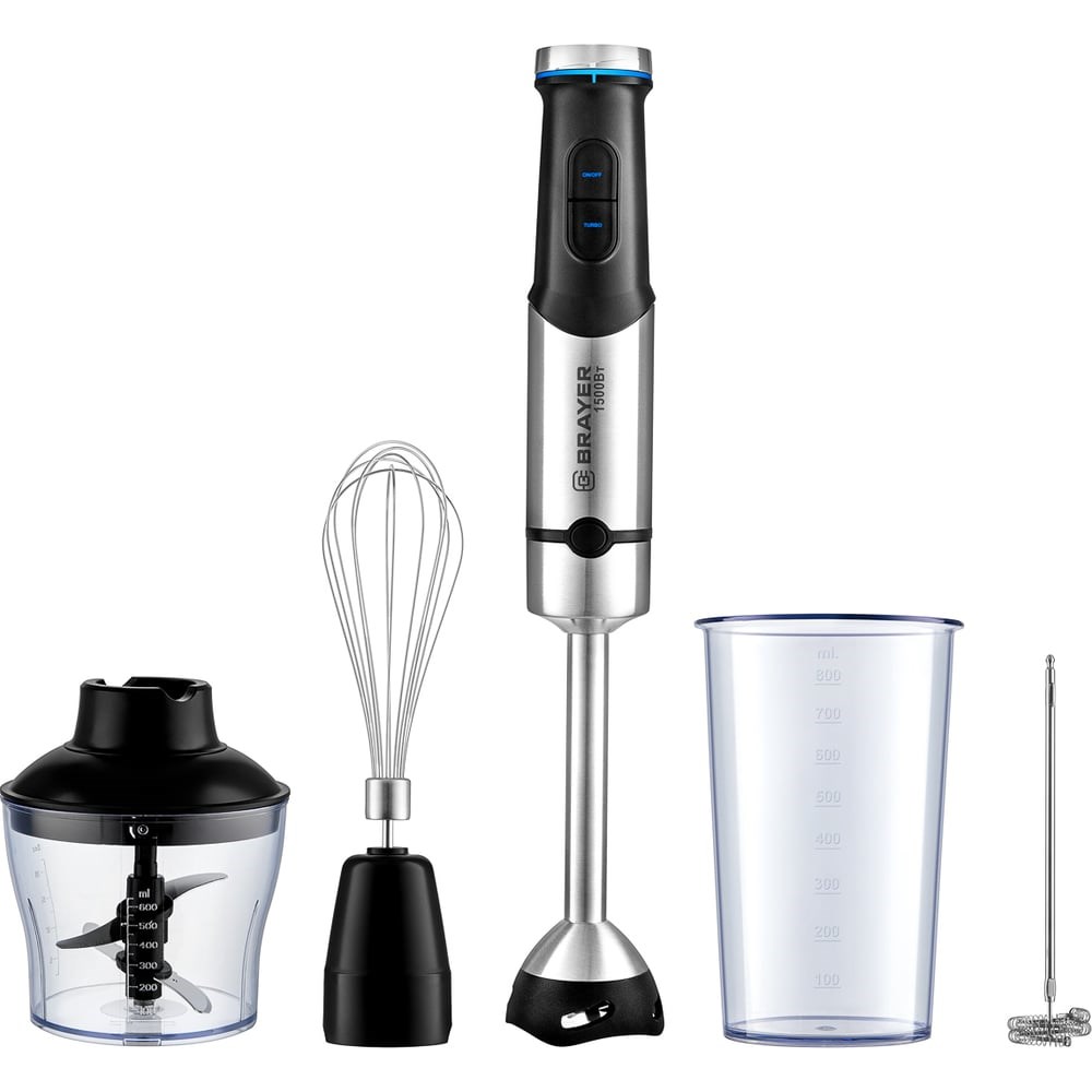 Мощность 1500 ВтПогружная часть блендера из нержавеющей стали с нейлоновым покрытием для предотвращения повреждения посудыЛезвия из титанаКорпус из пластика, декорирован нержавеющей стальюПогружная регулировка скоростиНасадка-венчик для взбиванияСтакан для смешивания 800 млНасадка-блендер для измельчения и смешиванияКапучинаторНасадка-измельчитель объемом 600 млЭлектропитание 220-240 В, ~ 50-60 Г