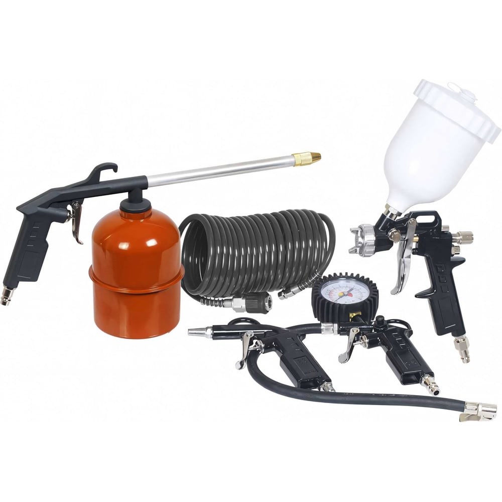 Покрасочный набор АвтоDело 5 пр. В/Б 42372 12139 используют для равномерного нанесения лакокрасочных и защитных покрытий, накачки шин, продувки узлов и агрегатов автомобилей, а также мойки под давлением. Все комплектующие набора снабжены быстросъемными разъемами с присоединительным размером 1/4". Спиральный полиуретановый шланг предусмотрен для подключения к воздушному компрессору. Рекомендованный размер сопла - 1.5 мм. Объем емкости для краски - 0.6 л.