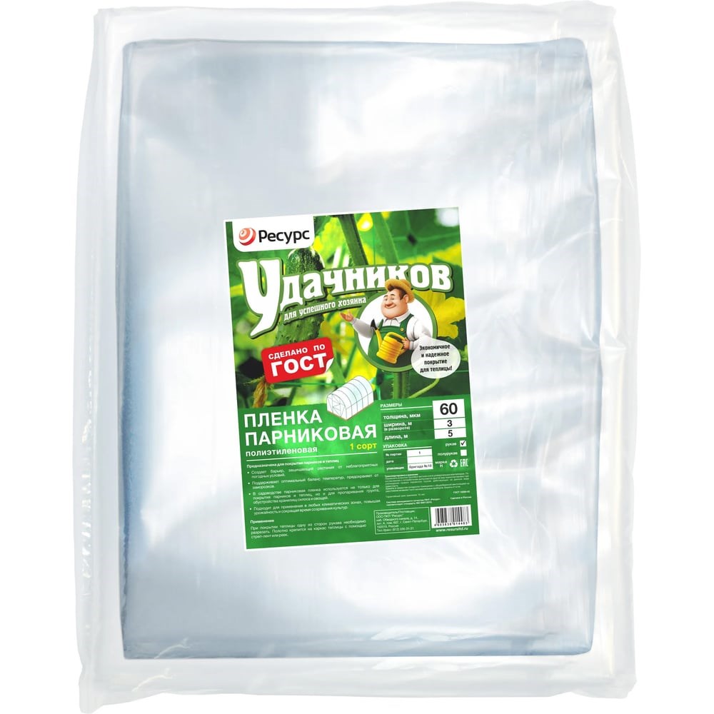 Пленка Удачников п/э 1 сорт 60 мк, 5х1.5м 19952 используется в сельском хозяйстве, строительстве. Изготовлена на основе первичного полиэтилена высокого давления по ГОСТ10354-82. Используется как упаковочный материал, тепло- и гидроизоляция, при возведении парников и теплиц. Гибкий и эластичный материал на основе полиэтилена высокого давления (ПВД), производится согласно ГОСТу 10354-82. Относительное удлинение при разрыве: в продольном направлении не менее 460%, в поперечном направлении не менее 450%. Прочность при растяжении: в продольном направлении 16,1 МПа, в поперечном направлении 14,7 МПа. Области применения. В строительстве: тепло- и гидроизоляция пола, подвалов, чердаков, кровли, отдельных элементов строительных конструкций, защита фасадов и фундаментов, при устройстве стяжек; изоляция трубопроводов; укрытие стройматериалов на строительных площадках и объектах, а также полов вовремя проведения штукатурно-малярных работ, укрытие оконных и дверных проемов. В сельском хозяйстве и садоводстве: при возведении парников и теплиц; укрытие и гидроизоляция силосных ям и овощехранилищ; мульчирование почвы (поверхностное покрытие почвы для её защиты и улучшения свойств), пропаривание грунта, защита грядок с рассадой. В промышленности и торговле: как упаковочный материал для практически любой продукции и различных грузов; в качестве укрывного материала для защиты от негативного воздействия внешней среды и сохранения товарного вида при транспортировке.