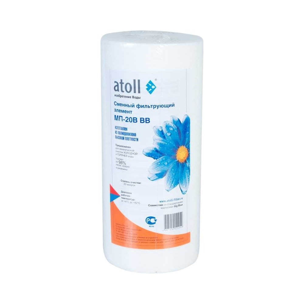 Картридж atoll МП-20В BB изготовлен из вспененного полипропилена и предназначен для использования в магистральных фильтрах холодной и горячей воды формата Big Blue 10 дюймов.Температура воды: от +4°C до +82°C.Картридж предназначен для механической очистки воды в целях защиты сантехники и прочего оборудования от песка, ржавчины, осадка и прочих твердых примесей крупнее 20 мкм в квартирах и загородных домах.Номинальный поток: 38 л/мин.