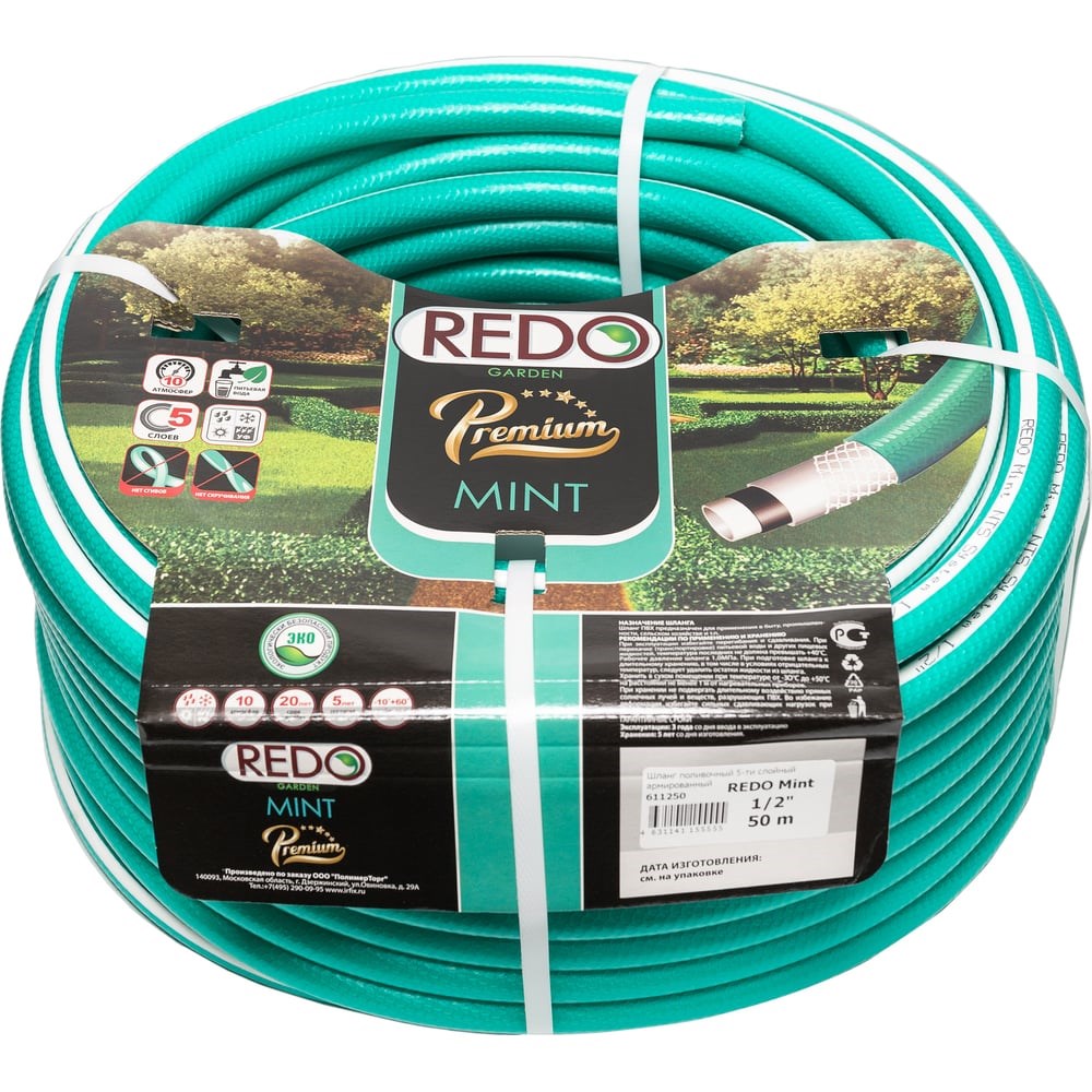 Поливочный армированный шланг REDO Premium Mint пятислойный, 1/2", 50 м 611250 предназначен для применения в быту, промышленности, сельском хозяйстве. Фирменные высокотехнологичные пятислойные шланги серии Premium, армируются полиэфирной нитью толщиной 55 текс методом "вязаного чулка", что придаёт продукции особую прочность, гибкость и долговечность. Имеет внутренний антибактериальный слой из пищевого пластиката. Защита от УФ излучения, рабочее давление до 10 атм.