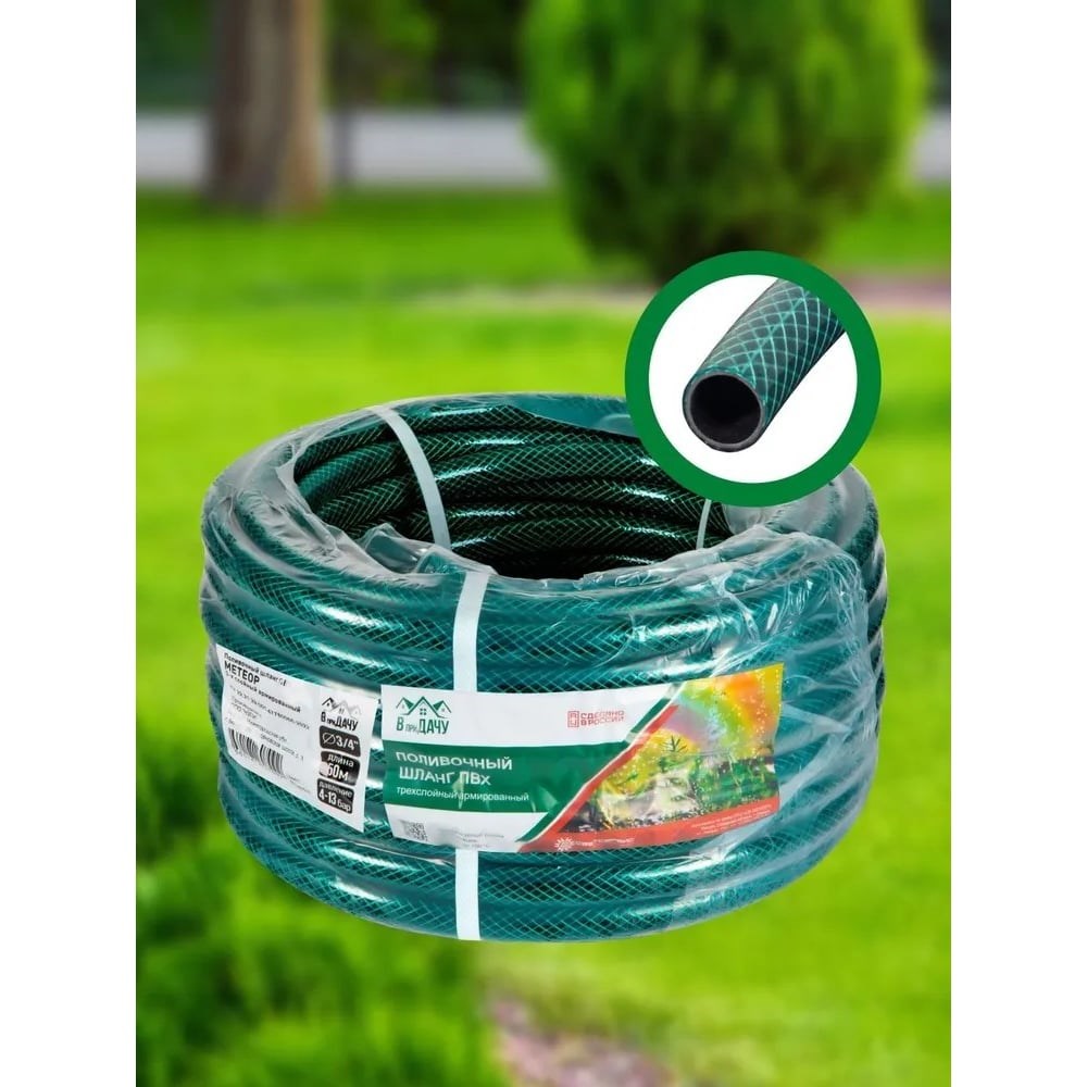 Шланг поливочный ПВХ Метеор 3-слойный армированный длиной 50 метров и диаметром 3/4 дюйма - это надежное решение для полива в бытовых условиях. Изготовленный из армированного ПВХ, он обеспечивает прочность и долговечность, что делает его устойчивым к внешним воздействиям. Трехслойная конструкция шланга способствует его устойчивости к перегибам и скручиванию, что облегчает его использование. Зеленый цвет шланга гармонично вписывается в окружающую среду, не нарушая эстетики сада или огорода. Шланг выдерживает давление до 13 бар и может эксплуатироваться при температуре от -5 до +50 градусов, что позволяет использовать его в различных климатических условиях. Отсутствие насадок делает его универсальным для подключения к различным системам полива. Трехслойный, армированный высокопрочной синтетической нитью шланг для полива, перекачки и прочих работ с жидкостями, в том числе с пищевыми. Внутренний слой ПВХ непрозрачный, черный, защищает от проникновения солнечных лучей и препятствует образованию водорослей внутри тела шланга. Наружный ПВХ слой прозрачный, окрашенный в зеленый цвет. При производстве используют специальные защитные добавки от воздействия внешних факторов, таких как ультрафиолетовое излучение, истирание. Между внутренним и наружным ПВХ слоями проложен высокопрочный плетеный корд из высокопрочной синтетической нити. Благодаря повышенным качественным показателям этот вид шланга имеет более высокие эксплуатационные характеристики (не заламывается и не перегибается).