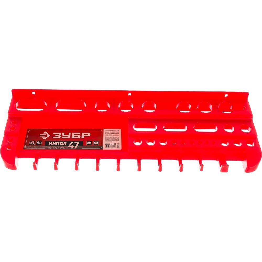 Полка для инструмента ЗУБР ИНПОЛ-47, 47 см, 38350-19_z02 подойдет для организации рабочего пространства. Прочный пластик легко справляется с большими нагрузками. Наличие большого количества различных по диаметру отверстий существенно упрощает хранение инструмента и его подбор для выполнения различных задач.