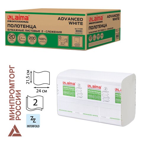 Полотенца бумажные 200 шт., LAIMA (H2) ADVANCED WHITE, 2-слойные, белые, КОМПЛЕКТ 20 пачек, 24х21,5, Z-сложение, 111338