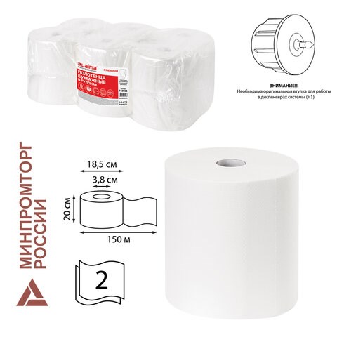Полотенца бумажные рулонные 150 м, LAIMA (Система H1) PREMIUM, 2-слойные, белые, КОМПЛЕКТ 6 рулонов, 112505