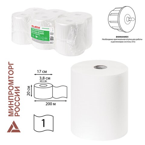 Полотенца бумажные рулонные 200 м, LAIMA (Система H1) ADVANCED, 1-слойные, белые, КОМПЛЕКТ 6 рулонов, 112503