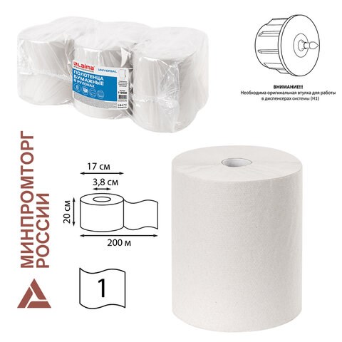 Полотенца бумажные рулонные 200 м, LAIMA (Система H1) UNIVERSAL, 1-слойные, серые, КОМПЛЕКТ 6 рулонов, 112502
