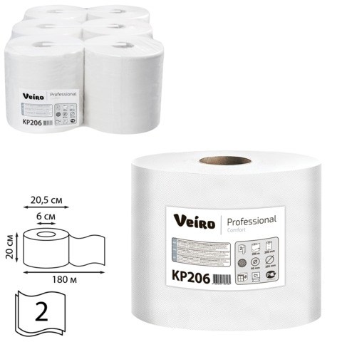 Полотенца бумажные с центральной вытяжкой 180 м, VEIRO (M4) COMFORT, 2-слойные, КОМПЛЕКТ 6 рулонов, KP206