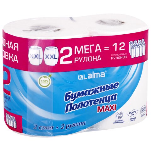 Полотенца бумажные спайка 2 рулона по 80 метров, LAIMA МЕГА РУЛОН, 2 слоя, 20х25 см, 100% целлюлоза, 116377