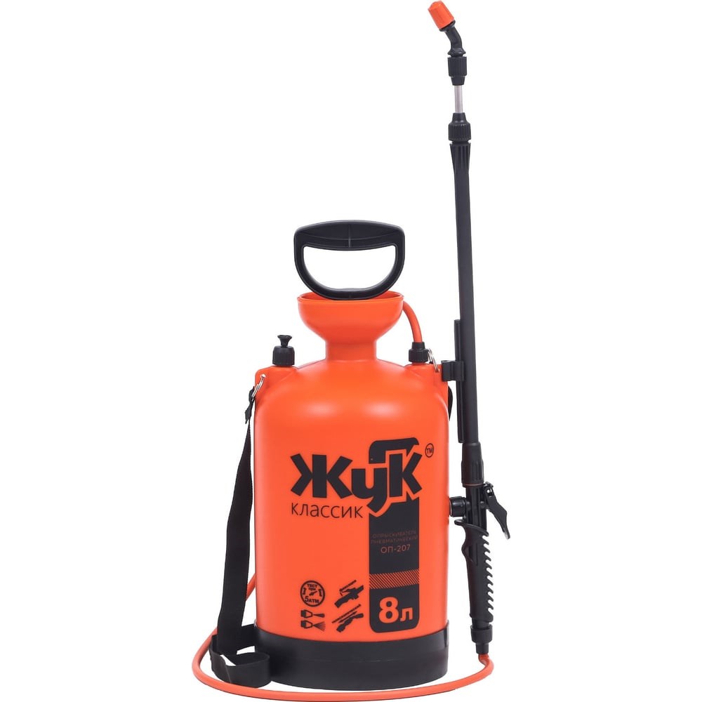 Опрыскиватель Жук ОП-207 8 л 4607156360444 применяется на садовом участке или в оранжерее для бережного полива растений или внесения жидких удобрений. Также может применяться для распыления чистящего средства при мытье стен, окон. Вместимость бака - 8 литров. Корпус изготовлен из качественного пластика, устойчивого к агрессивным веществам, содержащимся в удобрениях. Благодаря плечевым рукояткам опрыскивателем удобно пользоваться даже при обработке значительных территорий. Штанга телескопическая (ее длина регулируется от 650 до 970 мм).