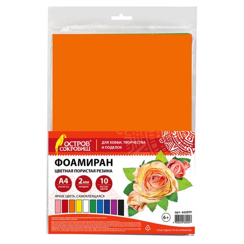 Пористая резина/фоамиран А4, 2 мм, НАБОР, 10 листов, 10 цветов, яркие цвета, самоклеящаяся, ОСТРОВ СОКРОВИЩ, 665099