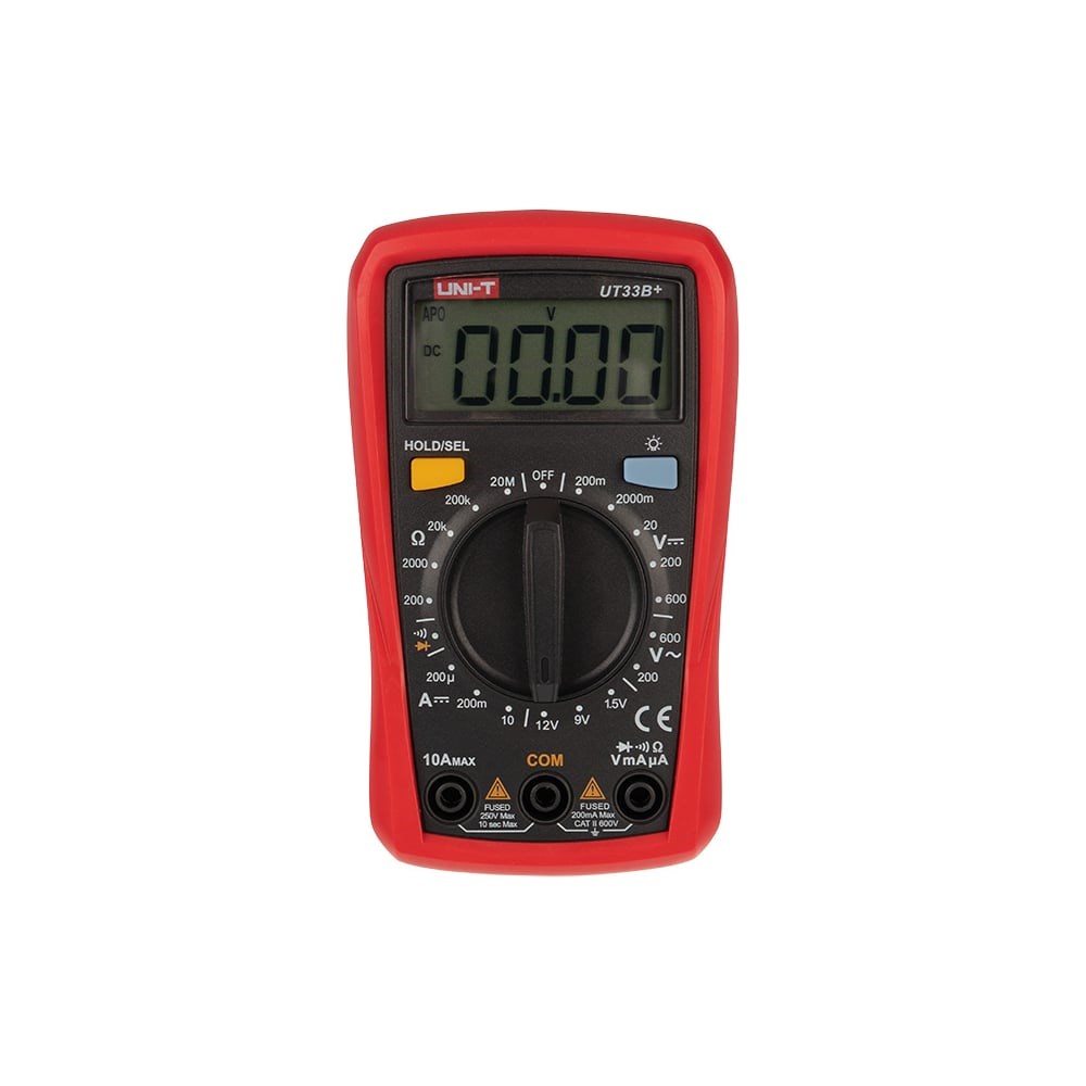 Портативный мультиметр UNI-T UT33B+ 13-0056 позволяет измерить постоянное и переменное напряжение, постоянный ток и сопротивление.ЖК-дисплей имеет подсветку, благодаря которой облегчается работа в слабоосвещенных местах.Прибор защищен от перегрузок, что обеспечивает безопасность в эксплуатации.Холстер защищает устройство от механических повреждений в случае падения.Мульти́метр — электроизмерительный прибор, который включает в себя несколько функций и набор измеряемых параметров. Все приборы серии UT-33 измеряют постоянное и переменное напряжение, постоянный ток и сопротивление в цепи. А также с помощью данного прибора можно проводить тестирование диодов и батареек. Прибор UT33B+ является портативным мультиметром, компактные размеры позволяют всегда носить его с собой. Но, несмотря на малые размеры, данный мультиметр обладает широким функционалом и это выгодно отличает его от других. Инженеры старались сделать прибор максимально удобным для использования. Выбор измеряемых величин и пределов измерений производится с помощью усиленного поворотного регулятора, благодаря которому исключается возможность случайного нажатия. Мультиметр UT33B+ оснащен функцией DATA HOLD, и зафиксировав результат измерений, вы в любое время сможете считать полученные значения.