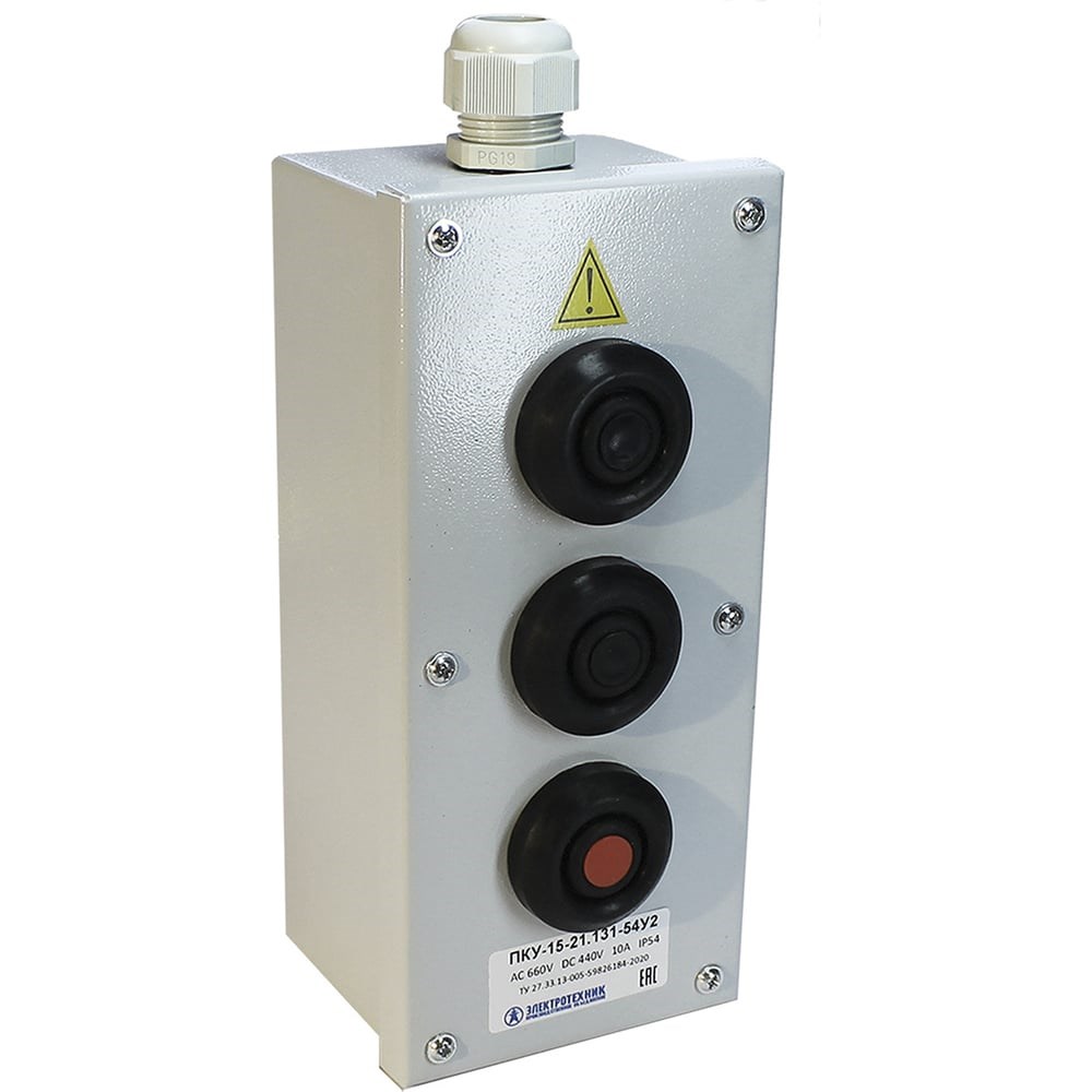 Посты управления кнопочные серии ПКУ 15-21 предназначены для коммутации электрических цепей управления переменного тока напряжением до 660В частотой 50Гц и постоянного тока до 440В. Посты представляют собой металлические оболочки со встроенными аппаратами. Посты, пристраиваемые к плоской поверхности, поставляются как с сальниками для уплотнения проводов, так и без них (оговаривается при заказе), а подвесные посты - только с сальниками. В постах могут быть 1 или 2 сальниковых ввода. Сальниковый ввод типа PG16; PG19; PG21; PG29; PG32 (по техническому заданию) Пост управления в металлическом корпусе, комплектуются коммутационными аппаратами ВК, КЕ, ПЕ, светосигнальной арматурой СКЛ, АЕ с оперативными табличками, с установочным отверстием диаметром 30мм. В постах со степенью защиты IР54 между корпусом и панелью в местах установки аппарата дополнительно установлены герметизирующие прокладки и гермошайбы.