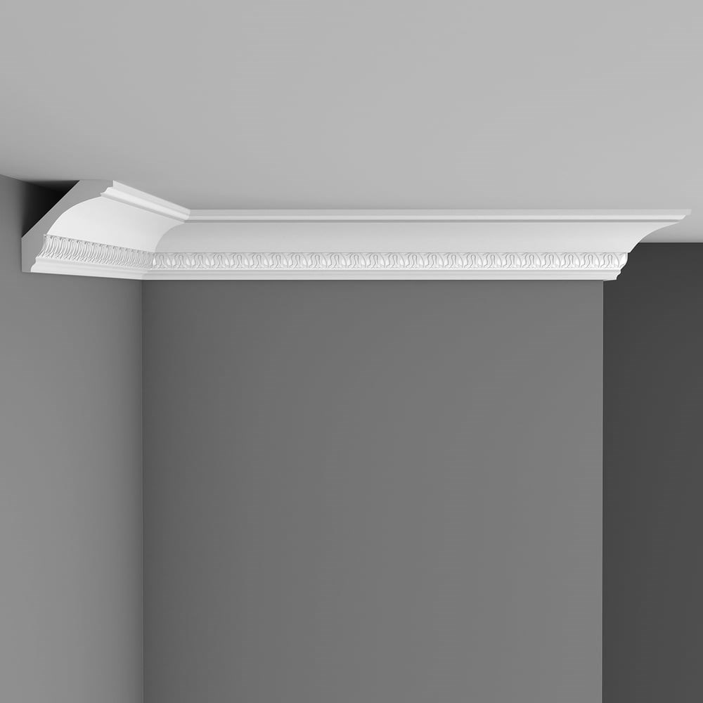 Потолочный плинтус Decomaster с рисунком, 69х69х2000 мм D100B скрывает неровности, а также выполняет декоративные задачи: с его помощью можно визуально объединить или четко разъединить плоскости потолка и стен.