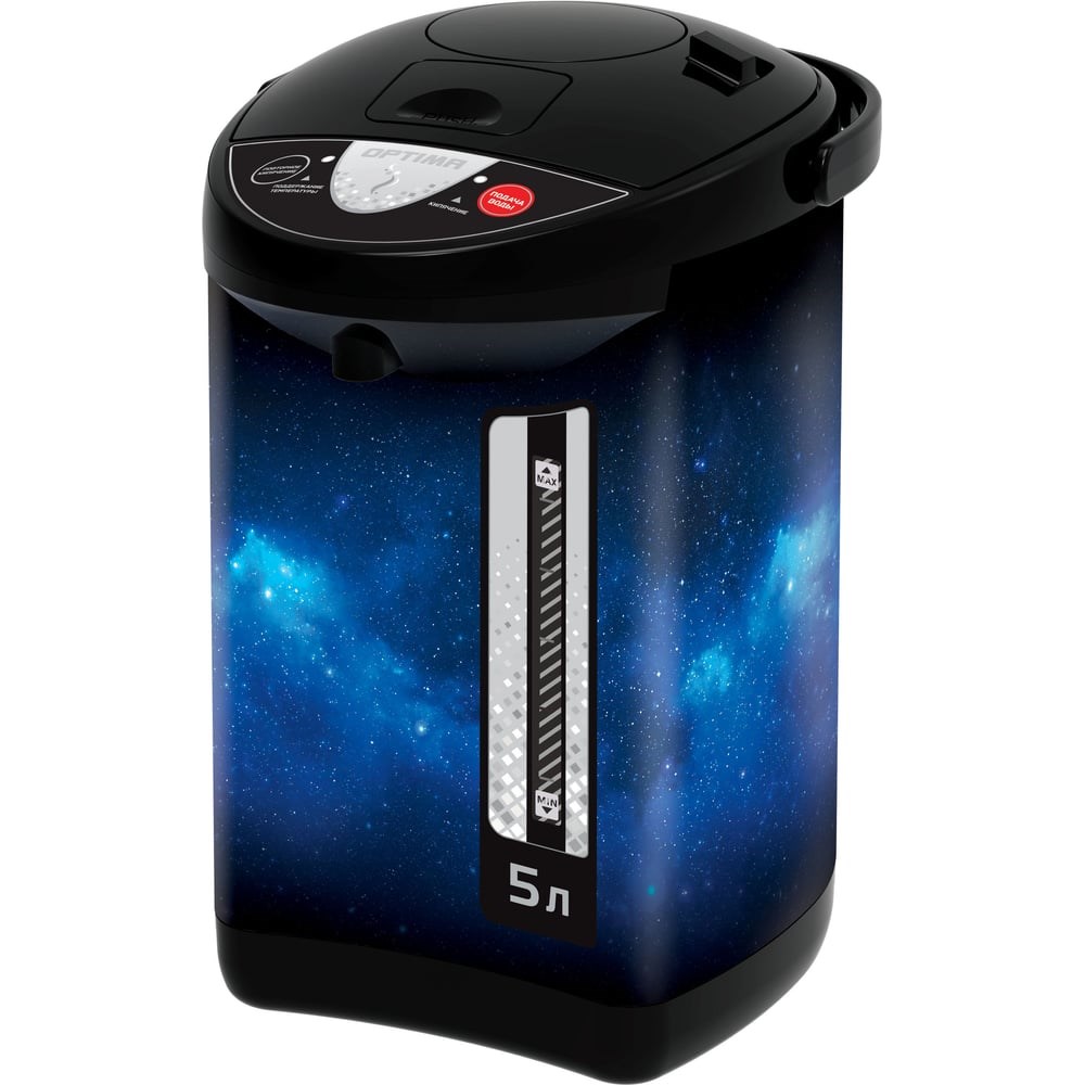 Поттер Optima AP-503S / 5.0л 3 сп. нал. воды бак из нерж.стали черн. пластик космос 900Вт / 2000571 обеспечивает нагрев воды и длительное сохранение тепла. Подходит для использования дома и на работе. Экономит энергию за счет уменьшения теплоотдачи. Корпус выполнен из нержавеющей стали - надежно защищен от коррозии, увеличивает срок службы. Чайник-термос снабжён пластиковой ручкой для удобства переноса. На верхней части поттера расположена и панель управления. Кнопка «ПОДАЧА ВОДЫ» включает электронасос и подаёт воду в чашку. Нажатием кнопки «ПОВТОРНОЕ КИПЯЧЕНИЕ» включается принудительный режим кипячения воды в поттере. На панели управления расположены два световых индикатора. Индикатор «поддержание температуры» сигнализирует о готовности чайника-термоса к работе, индикатор «кипячение» показывает процесс нагрева воды. Предусмотрено три способа налива воды: воздушная помпа (ручная), электронасос (кнопка), налив с помощью посуды.
