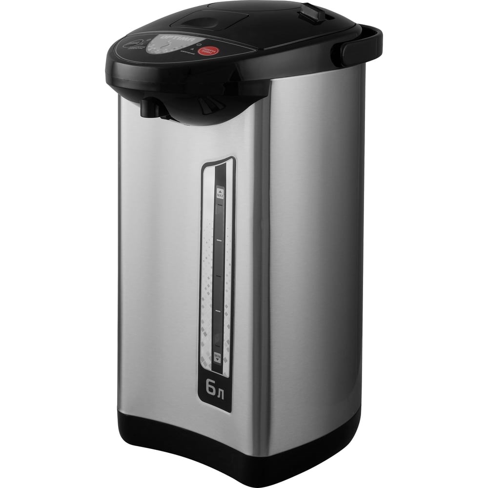 Поттер Optima AP-603S / 6.0л 3 сп. нал. воды бак из нерж.стали черн. пластик 900Вт / 2000572 обеспечивает нагрев воды и длительное сохранение тепла. Подходит для использования дома и на работе. Экономит энергию за счет уменьшения теплоотдачи. Корпус выполнен из нержавеющей стали - надежно защищен от коррозии, увеличивает срок службы чайника. Оснащен индикаторами уровня воды и нагрева, функцией поддержания температуры и защиты от перегрева. Чайник-термос снабжён пластиковой ручкой для удобства переноса. На верхней части поттера расположена и панель управления. Кнопка «ПОДАЧА ВОДЫ» включает электронасос и подаёт воду в чашку. Нажатием кнопки «ПОВТОРНОЕ КИПЯЧЕНИЕ» включается принудительный режим кипячения воды в поттере. На панели управления расположены два световых индикатора. Индикатор «поддержание температуры» сигнализирует о готовности чайника-термоса к работе, индикатор «кипячение» показывает процесс нагрева воды.