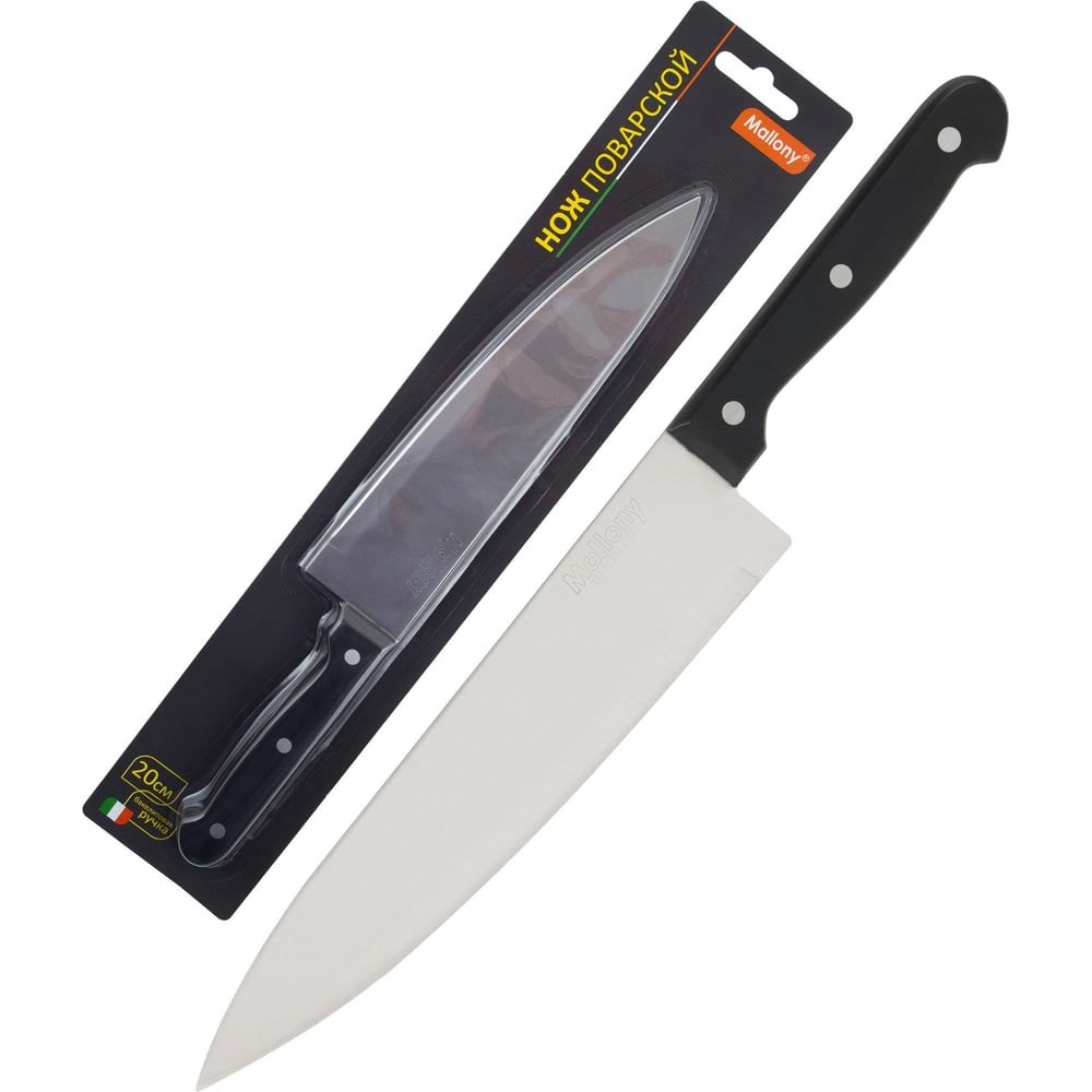 Нож с бакелитовой рукояткой Mallony MAL-01B поварской, 20 см 985301 подойдет для эксплуатации в быту, на кухне, в местах общественного питания. Нож изготовлен из прочной стали. Толщина клинка составляет 1.5 мм. Нож имеет стильный дизайн.