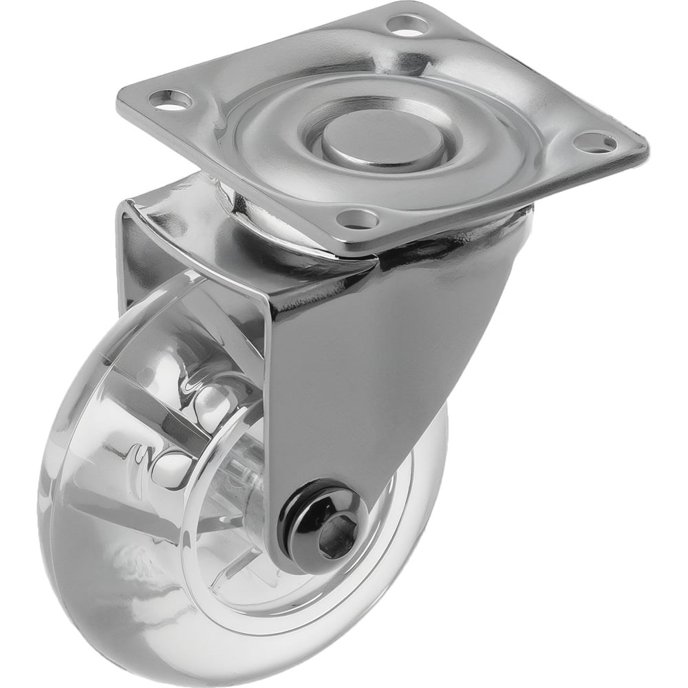 Мебельное поворотное полиуретановое колесо 44050S 50 мм, крепление площадка, прозрачное предназначено для установки в качестве подвижной опоры на мебель. Для универсального применения на самых разнообразных покрытиях.Удобное и надежное крепление на пластину с отверстиями под крепежные элементы выдерживает нагрузку до 30 кг.Подходит для использования на поверхностях с незначительными неровностями и мягких покрытиях без защиты от случайного передвижения с поворотным механизмом.