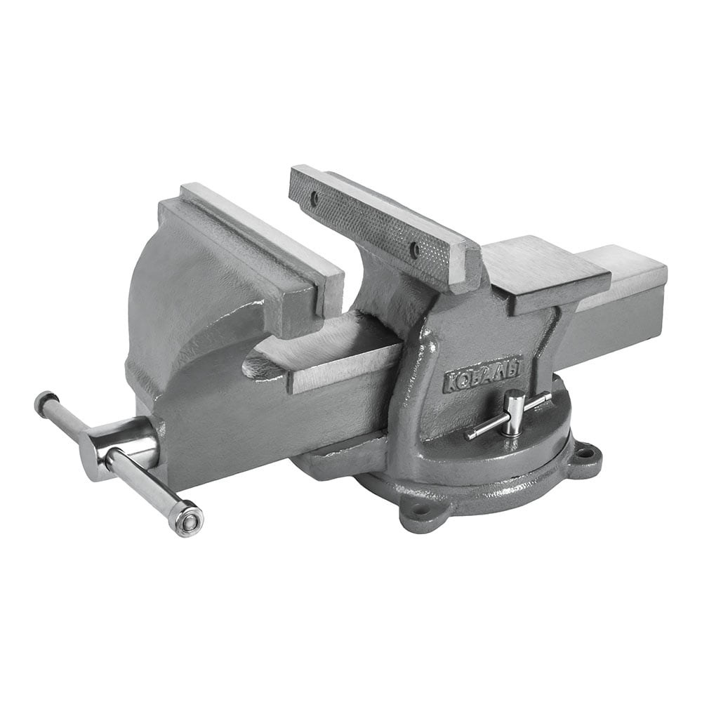 Тиски слесарные КОБАЛЬТ предназначены для зажима деталей в положении, обеспечивающем удобство при их обработке. Имеют рельефные губки и наковальню для мелких слесарных работ. Оснащены поворотным механизмом и отверстиями для крепления на верстаке.