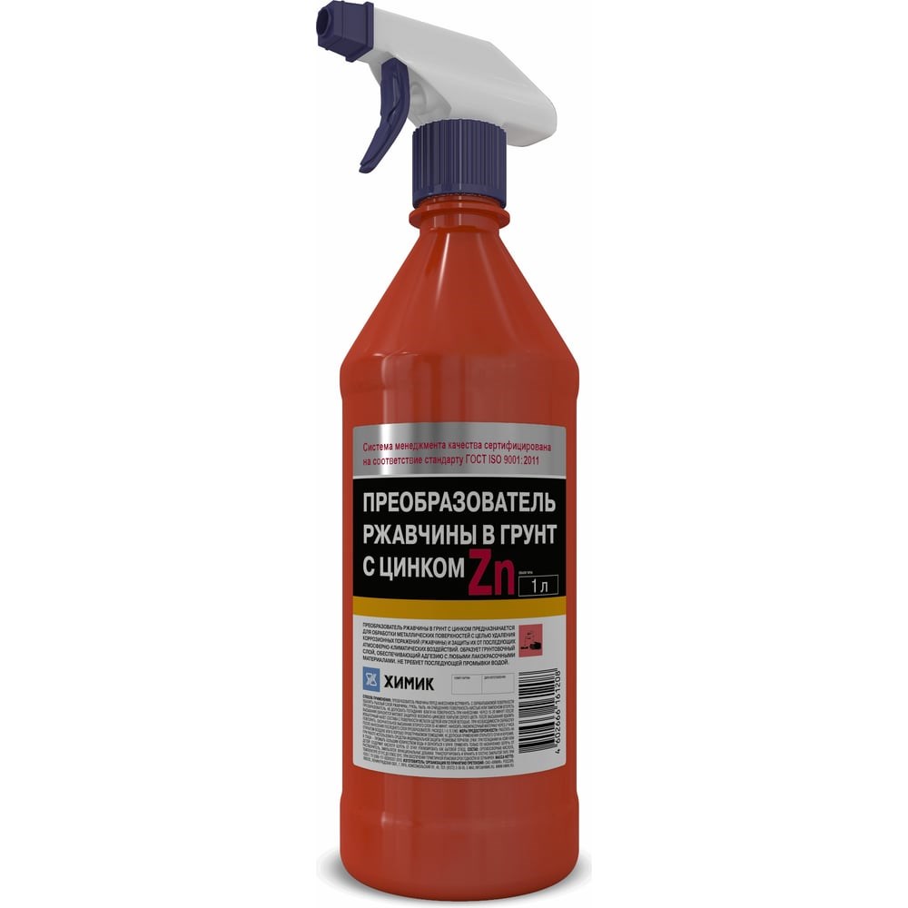 Преобразователь ржавчины ХИМИК с цинком,1 л, триггер 66161208 предназначен для обработки металлических поверхностей с целью удаления коррозионных поражений (ржавчины) и защиты их от последующих атмосферно-климатических воздействий. Состав образует грунтовочный слой, обеспечивающий адгезию с любыми лакокрасочными материалами. Не требует последующей промывки водой.