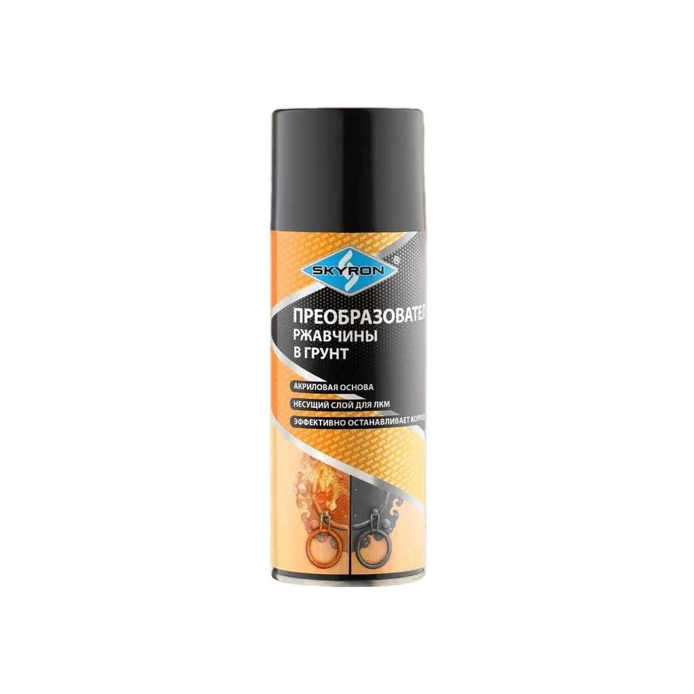 Преобразователь ржавчины в грунт SKYRON аэрозоль, 520 мл SR-29080 предназначен для борьбы с коррозией любых стальных изделий и подготовки поверхности металла, имеющего окалину и ржавчину, сварных швов и т.п., под окраску любыми лакокрасочными и антикоррозийными материалами на синтетической и натуральной основе. Композиция синтетического латекса и танина преобразует сплошной поверхностный слой ржавчины (не более 100 мкм) и ржавчину, в очаговых поражениях, в устойчивые соединения танната железа, образуя прочное водостойкое покрытие чёрного цвета, обладающее свойствами грунта. Не требует смывания водой, может служить временным антикоррозийным покрытием. Способ применения: При хранении допускается выпадение осадка, перед использованием энергично встряхнуть флакон в течение 1 мин. Удалить рыхлую и отслаивающуюся ржавчину металлической щеткой. Нанести состав кистью на обезжиренную поверхность в два слоя, при температуре окружающей среды не ниже + 10 °С. После полного высыхания, около 24 ч. при + 20 °С, желательно произвести окраску поверхности.