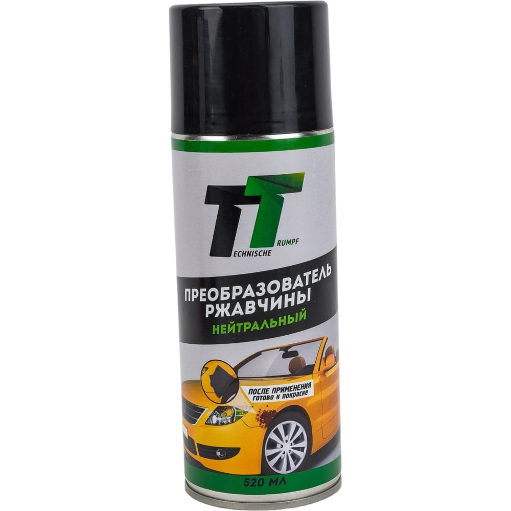 Преобразователь ржавчины TT 520 мл, аэрозоль AR05/75 эффективно нейтрализует ржавчину и образует прочное водонепроницаемое и термостойкое защитное покрытие. В результате химической реакции обработанный слой коррозии преобразуется в инертное покрытие, обладающее свойствами грунта под покраску, а также повышенными свойствами сцепления с поверхностью металла, что крайне важно для дальнейшей покраски. После обработки поражённого коррозией участка не требуется дополнительная механическая обработка поверхности — краска наносится как на обычный грунт. Благодаря отсутствию кислот в составе средства, обрабатываемые поверхности не нужно промывать перед нанесением специального покрытия. Также в составе отсутствуют токсичные и другие опасные вещества.
