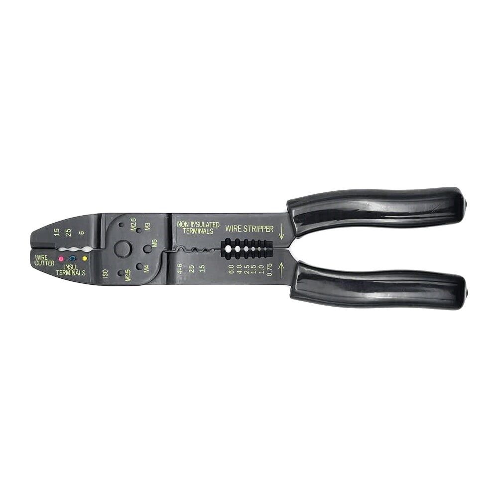 Пресс-клещи Felo для изолированных и неизолированных кабельных наконечников 0,75-6 мм2 59232040 применяются для качественной и быстрой резки кабелей, удаления изоляции с проводов, а также опрессовки кабельных кольцевых изолированных наконечников и штекеров. Подходят для зачистки проводов сечением от 0,75 до 6,0 мм, обжима клемм на проводах сечением от 1,5 до 6,0 мм. Также инструмент обладает режущими элементами для разрезания медных и латунных резьбовых шпилек М 2,6, М 3,0; М 3,5; М 4,0 и М 5,0. Клещи просты и удобны в применении, их прорезиненные рукоятки имеют эргономичную форму для удобства удержания, а корпус выполнен из прочной закаленной стали.