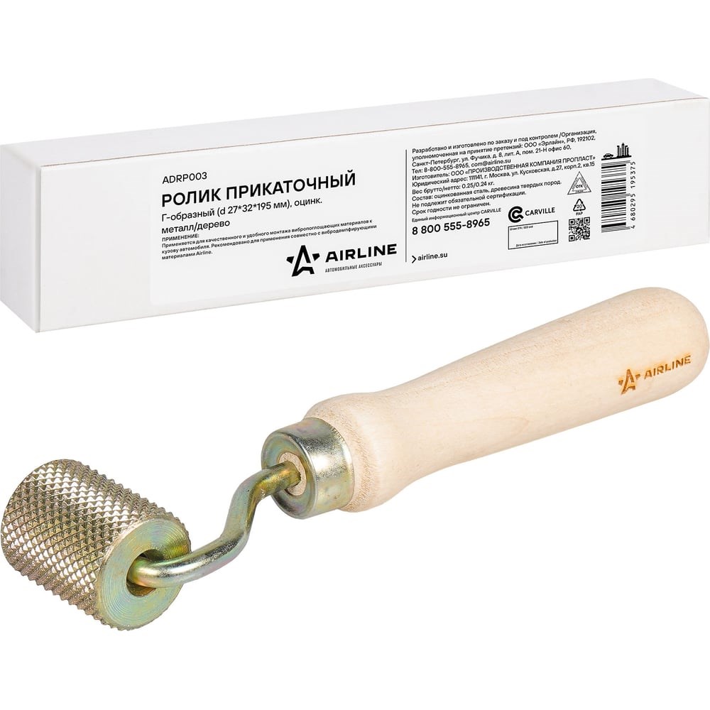 Прикаточный Г-образный ролик Airline оцинкованный металл, дерево ADRP003 предназначен для качественного и удобного монтажа вибропоглощающих материалов к кузову автомобиля. Металлический ролик снабжен насечкой, предотвращающей скольжение по алюминиевой фольге. Ролик предназначен для обеспечения максимально плотного контакта между вибродемпфирующим материалом и поверхностью кузова автомобиля. Все поверхности перед монтажом должны быть очищены от пыли, грязи, ржавчины, обезжирены и высушены.