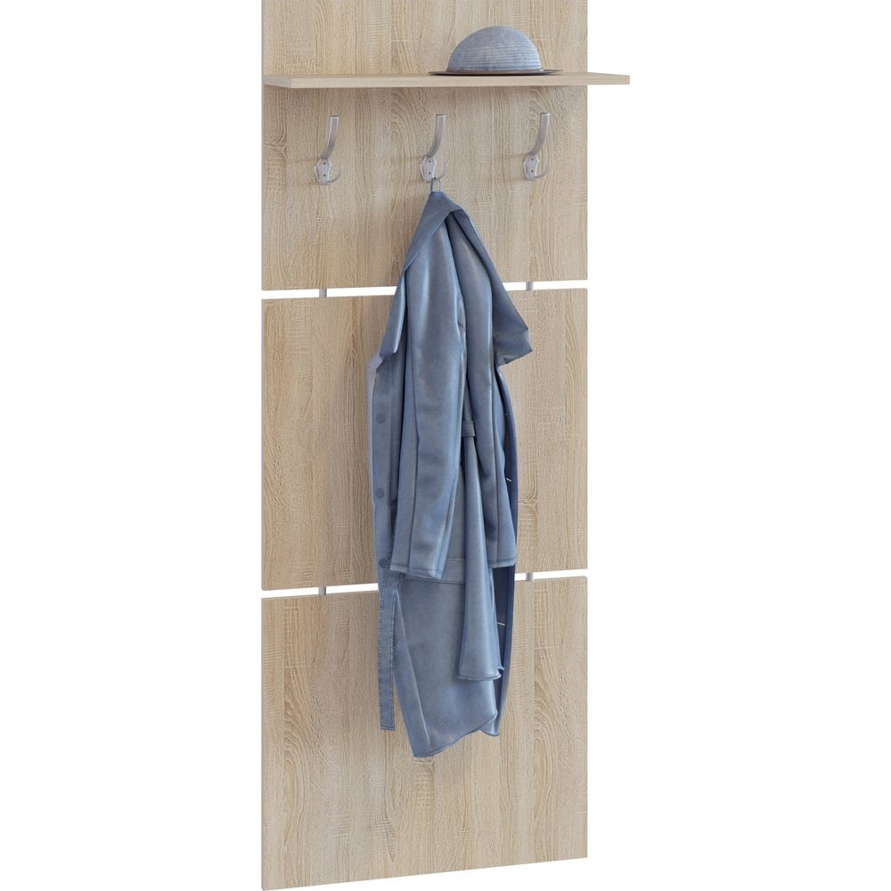 Прихожая СОКОЛ дуб сонома ВШ-5.1 ШОВШ5.1Дс, выполненная в строгом стиле, позволит разместить сезонную одежду всей семьи. Модель состоит из трех панелей, соединенных металлическими вставками. Полка, закрепленная над крючками для одежды, предназначена для головных уборов и зонтов. Крючки произведены из металла. Максимальная нагрузка на полку составляет 5 кг.