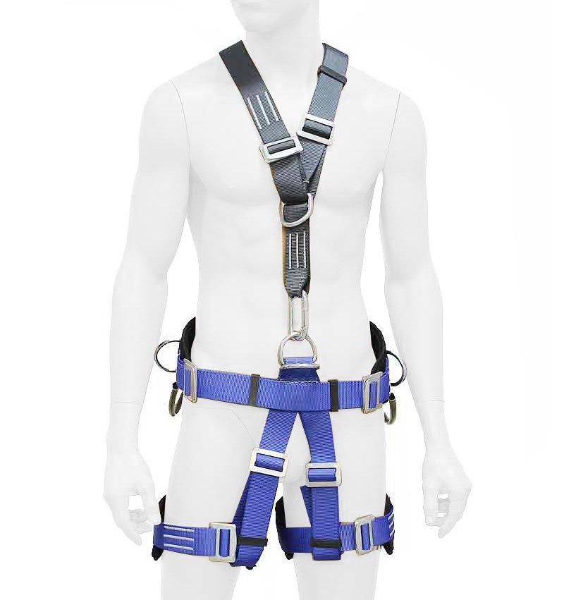 Страховочная привязь парашютного типа с наплечными и набедренными лямками, которые регулируется самофиксирующимися пряжками, двумя элементами крепления стропа для страховки(на груди и спине) и тремя - для удержания и позиционирования(на поясе).