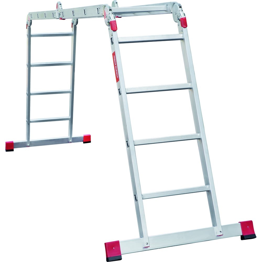 Профессиональная алюминиевая лестница-трансформер Новая Высота NV3320 4x4 ширина 400 мм 3320404 предназначена для профессионального и бытового применения. Использовать такую лестницу можно в виде стремянки, приставной конструкции, помоста и приставной согнутой лестницы. Многократная развальцовка в соединении ступеней со стойками обеспечивает высокую прочность и долговечность. Надежно закрепленные с помощью заклепок двухкомпонентные башмаки траверсы препятствуют скольжению. Две широкие поперечные траверсы обеспечивают высокую устойчивость при работе во всех положениях.