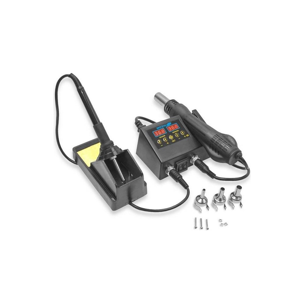 Паяльная станция МЕГЕОН 00380 – состоящая из термофена и паяльника, создана для лужения и распайки большого количества электрокомпонентов. Прибор получил компактные размеры блока управления и небольшой вес. У станции цифровое управление температурой термофена и паяльника и цифровая индикация температуры. Немаловажным преимуществом при работе с паяльником является маленький вес и мягкий провод. Большое количество сменных наконечников для паяльника разной формы (в комплект не входят). Быстрый разогрев и стабильная температура делают работу с бессвинцовыми припоями предельно простой и безопасной. В комплекте предусмотрено три наконечника к фену для выполнения точных работ, а паяльник имеет распространённый типоразмер, что позволяет расширить спектр специфической пайки путём приобретения дополнительных жал. Изделие по достоинству смогут оценить профессионалы и радиолюбители.
