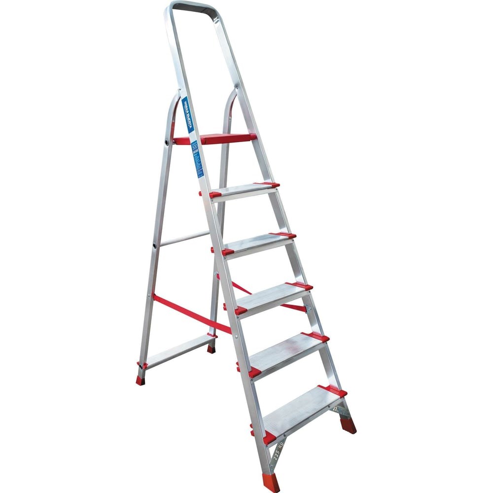 Профессиональная стремянка Новая Высота NV3117, 1x6 ступеней 130 мм 3117106 предназначена для интенсивного использования. При небольшом весе модель имеет повышенную прочность и надёжность. Она легко устанавливается и обеспечивает высокий уровень комфорта. Ступени и стойки выполнены из прессованных алюминиевых профилей увеличенного сечения, что обеспечивает надежность конструкции и продолжительный срок службы. Рифлёная поверхность ступеней способствует безопасному подъёму и спуску. Прочное крепление ступеней к боковинам 6 заклёпками придаёт конструкции высокую устойчивость. Опорные наконечники из прочного пластика обеспечивают устойчивое положение стремянки на поверхности. Практичность и внимание к каждой детали гарантируют безопасность работы на любой высоте.