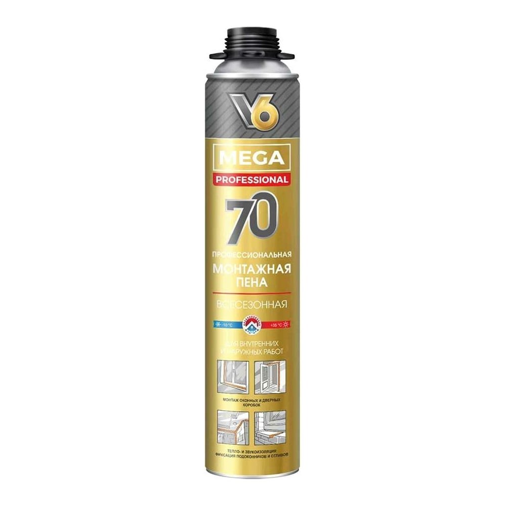 Пена V6 MEGA 70 (профессиональная; всесезонная; 900 гр) 11607325 - это однокомпонентная, готовая к применению, полиуретановая пена в аэрозольной упаковке. В качестве газа-вытеснителя применяется углеводородный пропеллент. Затвердевает под действием влаги воздуха и влаги поверхности, на которую наносится. Затвердевшая пена относится к классу полужестких пен.