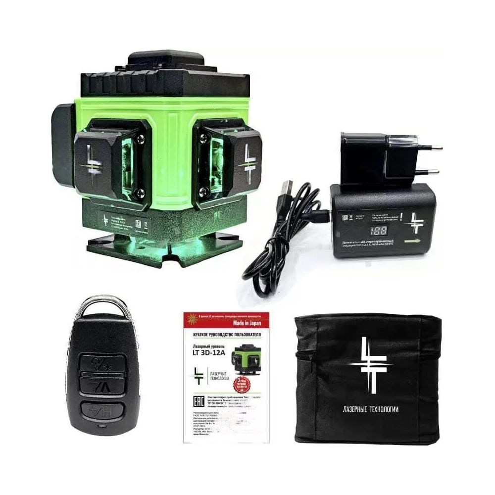 Представляем новую модель построителя лазерных плоскостей LT серии А 12 линий 360 градусов с японскими светодиодами sharp. Уровень выстраивает 3 плоскости в 360 градусов (в круговую): - 2 вертикальные плоскости 360 градусов с пересечением под прямым углом 90 градусов-.1 горизонтальная линии 360 градусов снизу уровня. Нижний горизонт идеально подходит для работ по заливки полов и стяжки. Работает от Аккумулятор литий-ионный Li-Ion 6000 Мач (в комплекте идёт две батареи) с зарядным устройством. Зарядное устройство USB. Устройство можно заряжать во время эксплуатации как от блока питания, так и от power bank. Особенности: До 8 часов работы при постоянном свечение луча. Лучи включаются как с сенсорных кнопок на корпусе устройства, так и с пульта дистанционного управления. Зеленый цвет луча лучше виден на свету и менее вреден для глаз. Дальность до 50 метров (в зависимости от освещения). При помощи приемника (отражателя) лазерных лучей (приобретается отдельно) можно работать в солнечную погоду. Противоударная и влагозащитная сумка для переноски устройства.