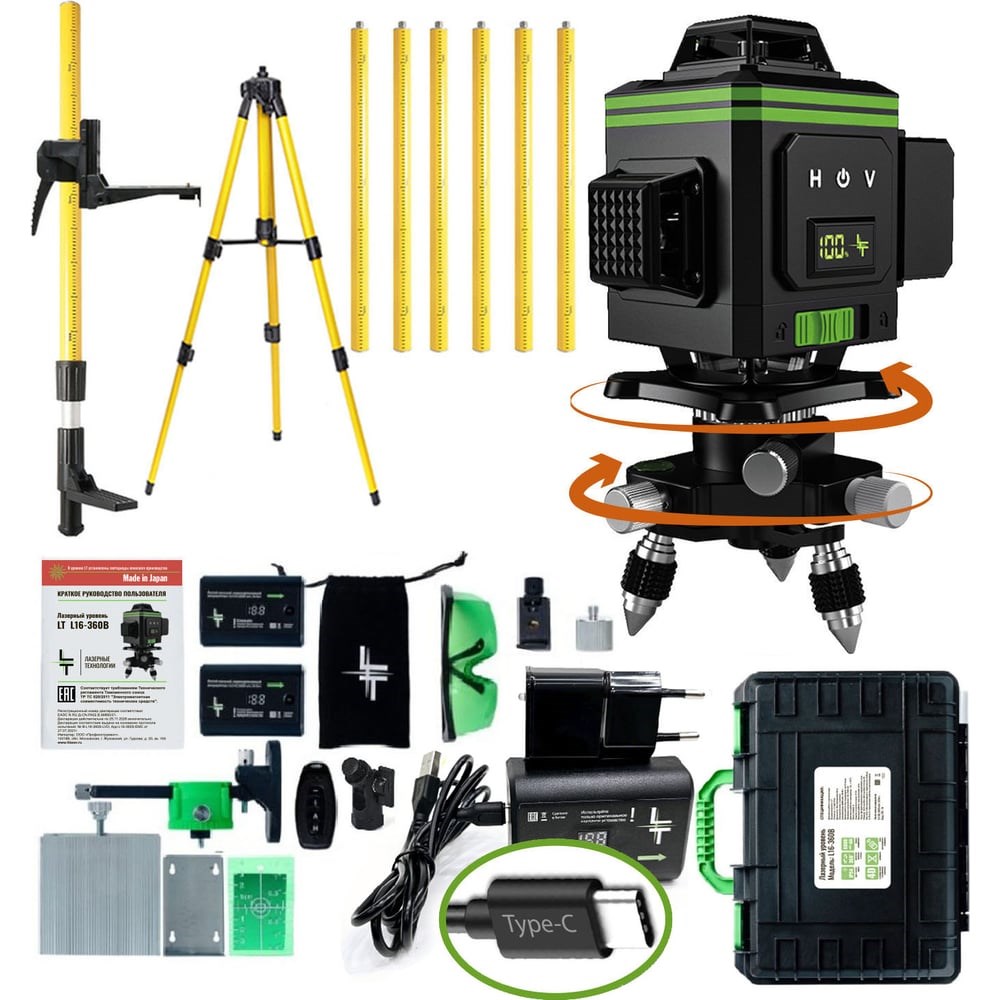 Профессиональный лазерный уровень LT L16-360B + штатив 4.8 м L16-360B/4.8м/1.6м выстраивает 4 плоскости в 360 градусов (в круговую): 2 вертикальные плоскости с пересечением под прямым углом и 2 горизонтальные линии снизу и сверху уровня. Работает от Li-ion батареи 6000 мАч с зарядным устройством. Особенности: до 8 часов работы при постоянном свечение луча; лучи включаются как с сенсорных кнопок на корпусе устройства, так и с пульта дистанционного управления; зеленый цвет луча лучше виден на свету и менее вреден для глаз; противоударный и влагозащитный кейс для переноски устройства. Модель проходит трехступенчатый контроль проверки качества сборки на заводе-производителе и инспекционный контроль приемки товара.