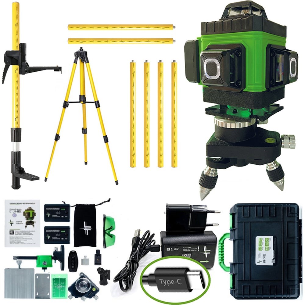 Профессиональный лазерный уровень LT L16-360Z + штатив 4.8 м L16-360Z/4.8м/1.6м выстраивает 4 плоскости в 360 градусов (в круговую): 2 вертикальные плоскости с пересечением под прямым углом и 2 горизонтальные линии снизу и сверху уровня. Работает от Li-ion батареи 6000 мАч с зарядным устройством. Особенности: до 8 часов работы при постоянном свечение луча; лучи включаются как с сенсорных кнопок на корпусе устройства, так и с пульта дистанционного управления; зеленый цвет луча лучше виден на свету и менее вреден для глаз; противоударный и влагозащитный кейс для переноски устройства. Модель проходит трехступенчатый контроль проверки качества сборки на заводе-производителе и инспекционный контроль приемки товара.