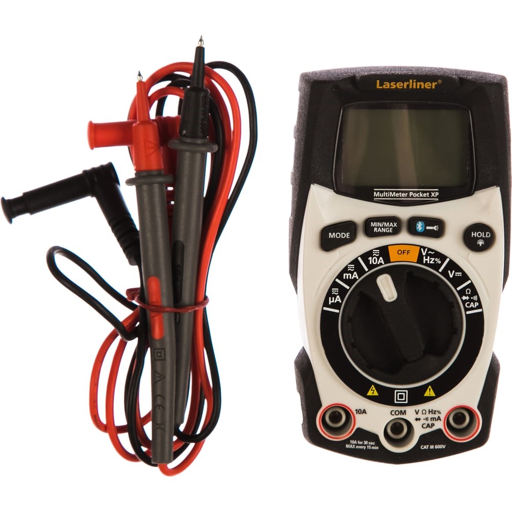 Профессиональный мультиметр Laserliner MultiMeter Pocket XP 083.036A подходит для всех видов электроизмерительных работ. С его помощью можно измерить напряжение, силу тока, сопротивление, емкость, частоту и коэффициент заполнения. Полученные данные выводятся на дисплей высокого разрешения с разрядностью 4000. Прибор имеет возможность автоматического изменения диапазона и ручной предварительный выбор. Автоотключение мультиметра после 15 минут бездействия позволяет экономить заряд элементов питания.