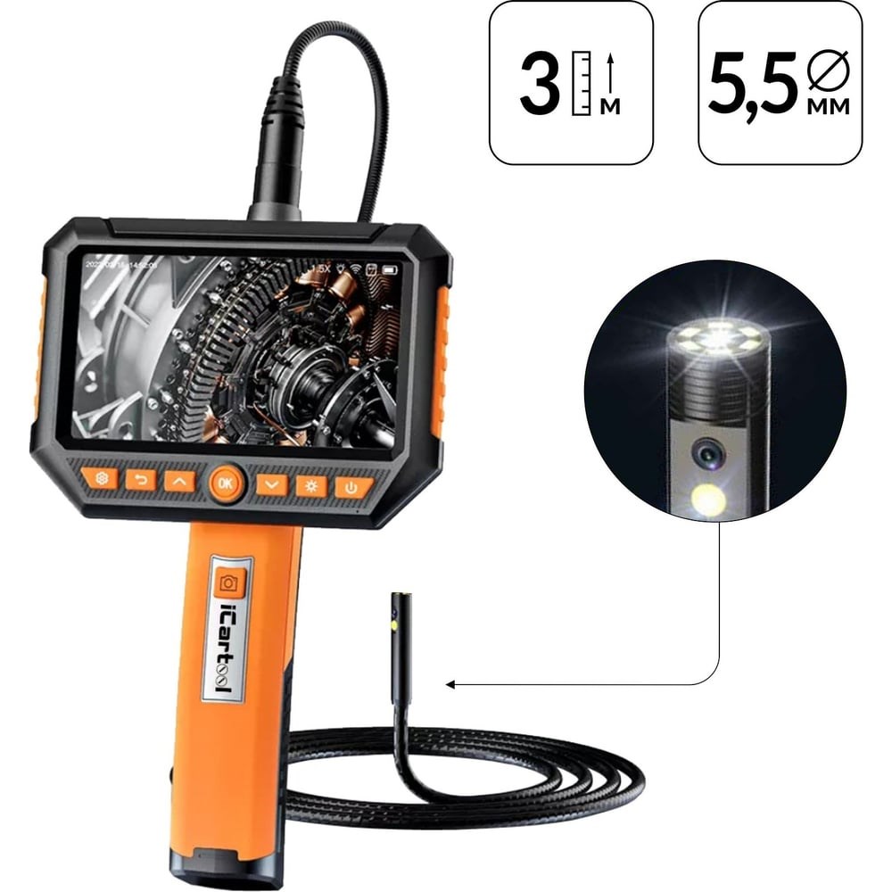 Промышленный видеоэндоскоп iCartool IC-V116B-3 с длиной зонда 3 метра и двумя камерами – это высокотехнологичное устройство, предназначенное для инспекции труднодоступных мест и внутренних полостей. Идеально подходит для использования в таких отраслях, как машиностроение, строительство, энергетика и ремонт.Ключевые преимуществаКамера эндоскопа диаметром всего 5,5 мм и гибкий зонд длиной 3 метра идеально подходят для работы в ограниченных пространствахДве камеры: возможность одновременного получения изображений с разных углов значительно увеличивает объем информации для анализа, что особенно полезно при осмотре сложных объектов.Дисплей 5” c IPS матрицей: позволяет видеть изображение без искажений и потери цветопередачи при взгляде под углом.Хранение данных: встроенная память позволяет сохранять видео и фото, сделанные во время осмотра, что облегчает дальнейший анализ и документирование результатов.Сменные зонды: предусмотрена возможность замены зонда, а также подбора зонда по длине и диаметру для различных задачДоступные диаметрыØ 8.0 мм,10 м – с 2 камерамиØ 8.0 мм, 5 м – с 2 камерамиØ 8.0 мм, 1 м – с 3 камерамиØ 5.5 мм, 3 м – с 2 камерамиØ 5.5 мм, 1 м – с 2 камерамиØ 3.9 мм, 1 м – с 1 камеройПереключение между камерами, а также использование дополнительных функций происходит с помощью кнопочной панели управления.Эндоскоп позволяет транслировать процесс съемки на смартфон/планшет посредством Wi-Fi соединения. Доступна функция записи/воспроизведения видео со звуком.