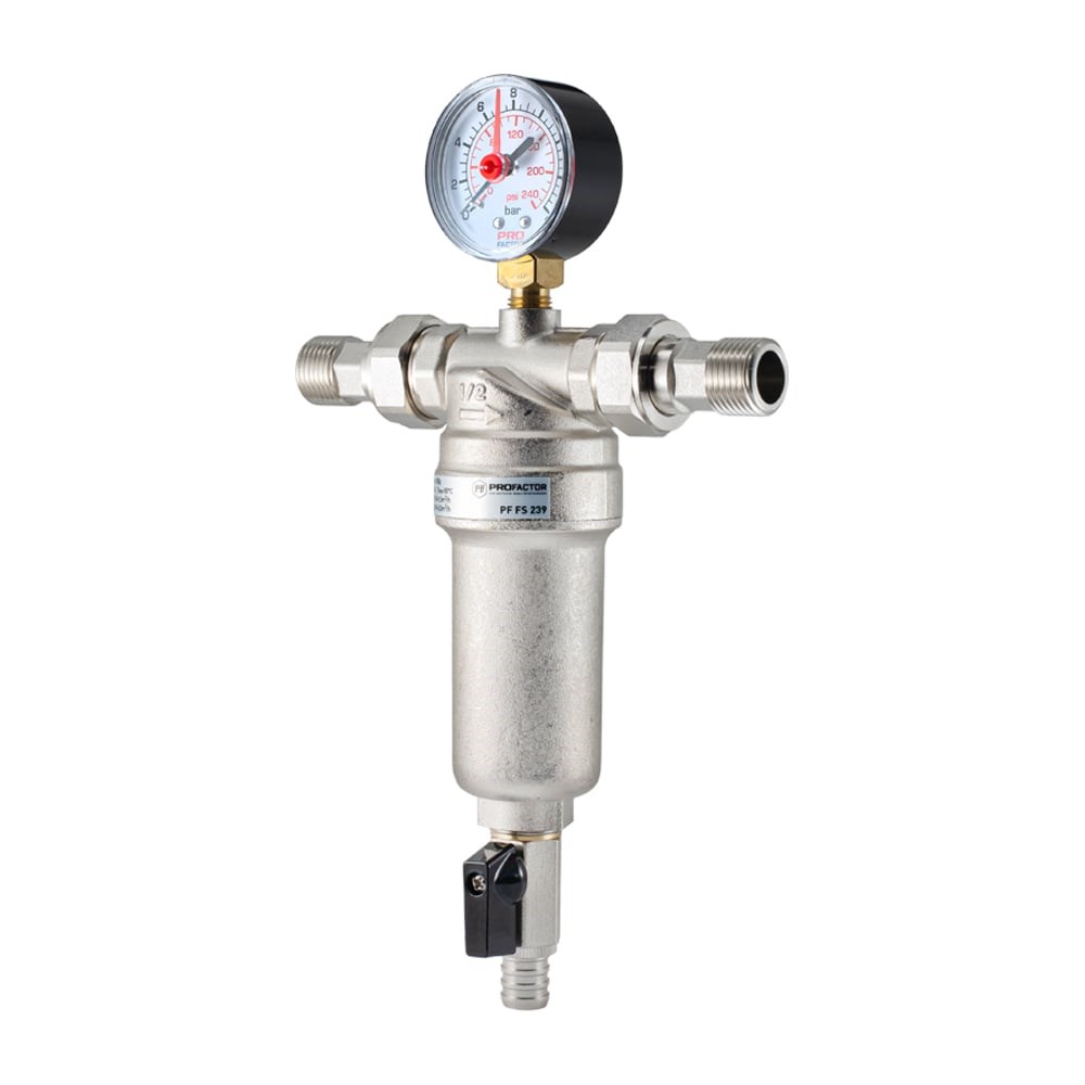 Фильтр промывной с манометром для горячей воды PROFACTOR 1/2" PF FS 239G предназначен для очистки воды от механических загрязнений. Он защищает водопровод, а также установленную на нём арматуру и оборудование от нерастворимых в воде примесей: песка, стружки, ржавчины и т.д. Конструкция фильтра предусматривает возможность быстрой очистки фильтрующего элемента без разборки и демонтажа. Для обеспечения правильной работы промывные фильтры устанавливаются в горизонтальном положении сливным штуцером вниз. Промывные фильтры PROFACTOR® поставляются в двух вариантах комплектации по типу колб: прозрачная колба из поликарбоната – рекомендуется для холодной воды; из никелированной латуни – для горячей воды.