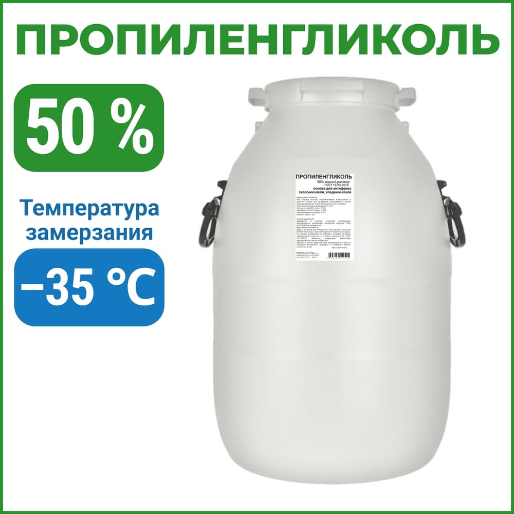 50-процентный водный раствор пропиленгликоля используется в качестве экологичной основы антифризов для автомобилей и систем кондиционирования, а также основы теплоносителей для систем отопления бытового и промышленного назначения. Обеспечивает стабильную работу теплообменного оборудования в диапазоне температур от от −35 °C до +108 °C. ГОСТ 19710-2043. Пропиленгликоль безопасен для здоровья человека, не образует ядовитых соединений и легко утилизируется по окончании срока эксплуатации. Плотность при 20 ℃ — 1.039 г/см3 Теплоемкость при 20 ℃ — 0.852 кДж/кг Теплопроводность — 0.42 Вт/м·К Вязкость — 2.2 МПа∙с