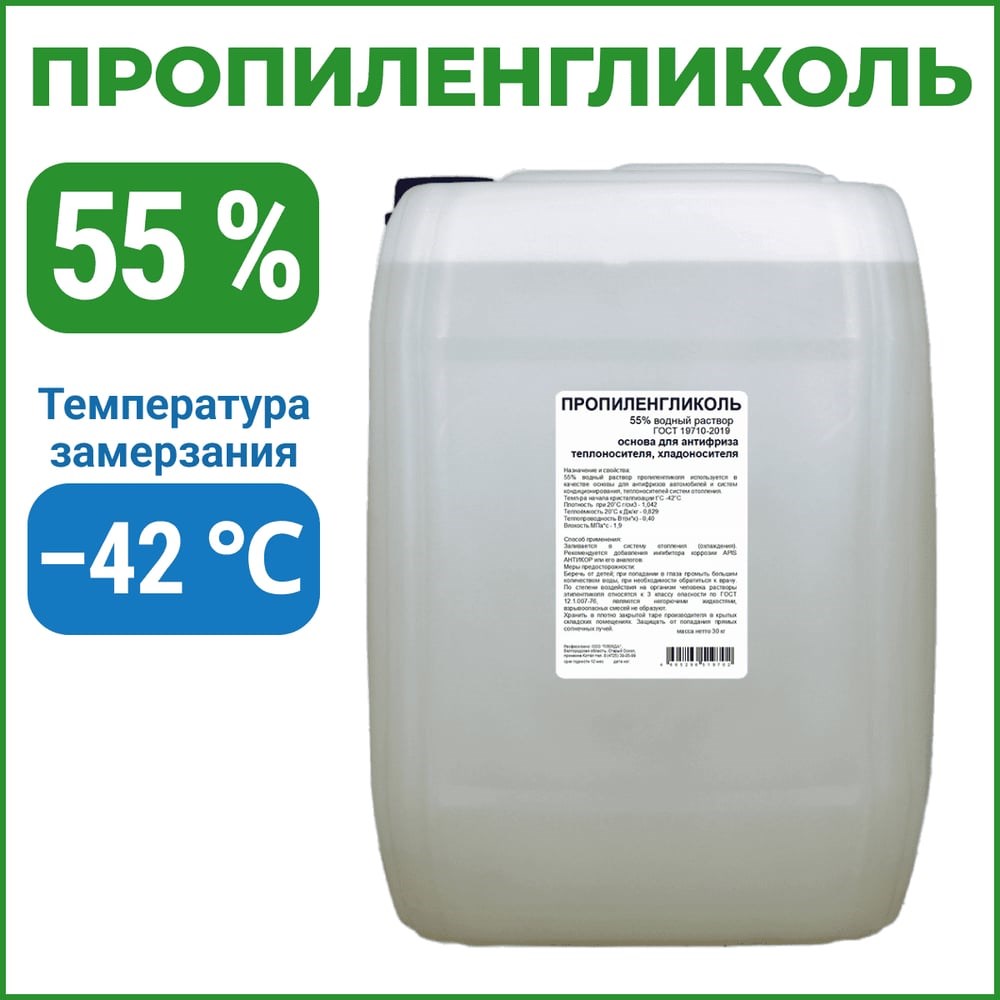 55-процентный водный раствор пропиленгликоля используется в качестве экологичной основы антифризов для автомобилей и систем кондиционирования, а также основы теплоносителей для систем отопления бытового и промышленного назначения. Обеспечивает стабильную работу теплообменного оборудования в диапазоне температур от от −42 °C до +108 °C. ГОСТ 19710-2043. Пропиленгликоль безопасен для здоровья человека, не образует ядовитых соединений и легко утилизируется по окончании срока эксплуатации. Плотность при 20 ℃ — 1.042 г/см3 Теплоемкость при 20 ℃ — 0.829 кДж/кг Теплопроводность — 0.4 Вт/м·К Вязкость — 1.9 МПа∙с