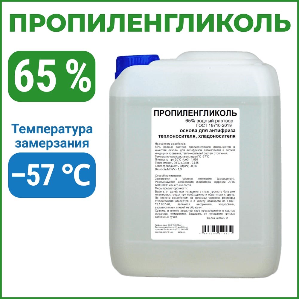 65-процентный водный раствор пропиленгликоля используется в качестве экологичной основы антифризов для автомобилей и систем кондиционирования, а также основы теплоносителей для систем отопления бытового и промышленного назначения. Обеспечивает стабильную работу теплообменного оборудования в диапазоне температур от от −57 °C до +108 °C. ГОСТ 19710-2043. Пропиленгликоль безопасен для здоровья человека, не образует ядовитых соединений и легко утилизируется по окончании срока эксплуатации. Плотность при 20 ℃ — 1.050 г/см3 Теплоемкость при 20 ℃ — 0.785 кДж/кг Теплопроводность — 0.36 Вт/м·К Вязкость — 1.3 МПа∙с