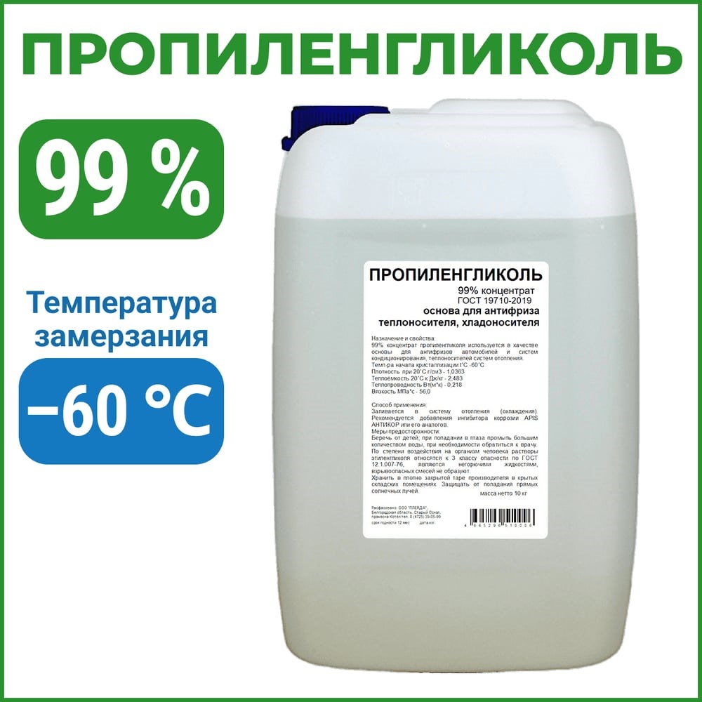 99-процентный водный раствор пропиленгликоля используется в качестве экологичной основы антифризов для автомобилей и систем кондиционирования, а также основы теплоносителей для систем отопления бытового и промышленного назначения. Обеспечивает стабильную работу теплообменного оборудования в диапазоне температур от от −60 °C до +108 °C. ГОСТ 19710-2043. Пропиленгликоль безопасен для здоровья человека, не образует ядовитых соединений и легко утилизируется по окончании срока эксплуатации. Плотность при 20 ℃ — 1.0363 г/см3 Теплоемкость при 20 ℃ — 2.483 кДж/кг Теплопроводность — 0.218 Вт/м·К Вязкость — 56 МПа∙с