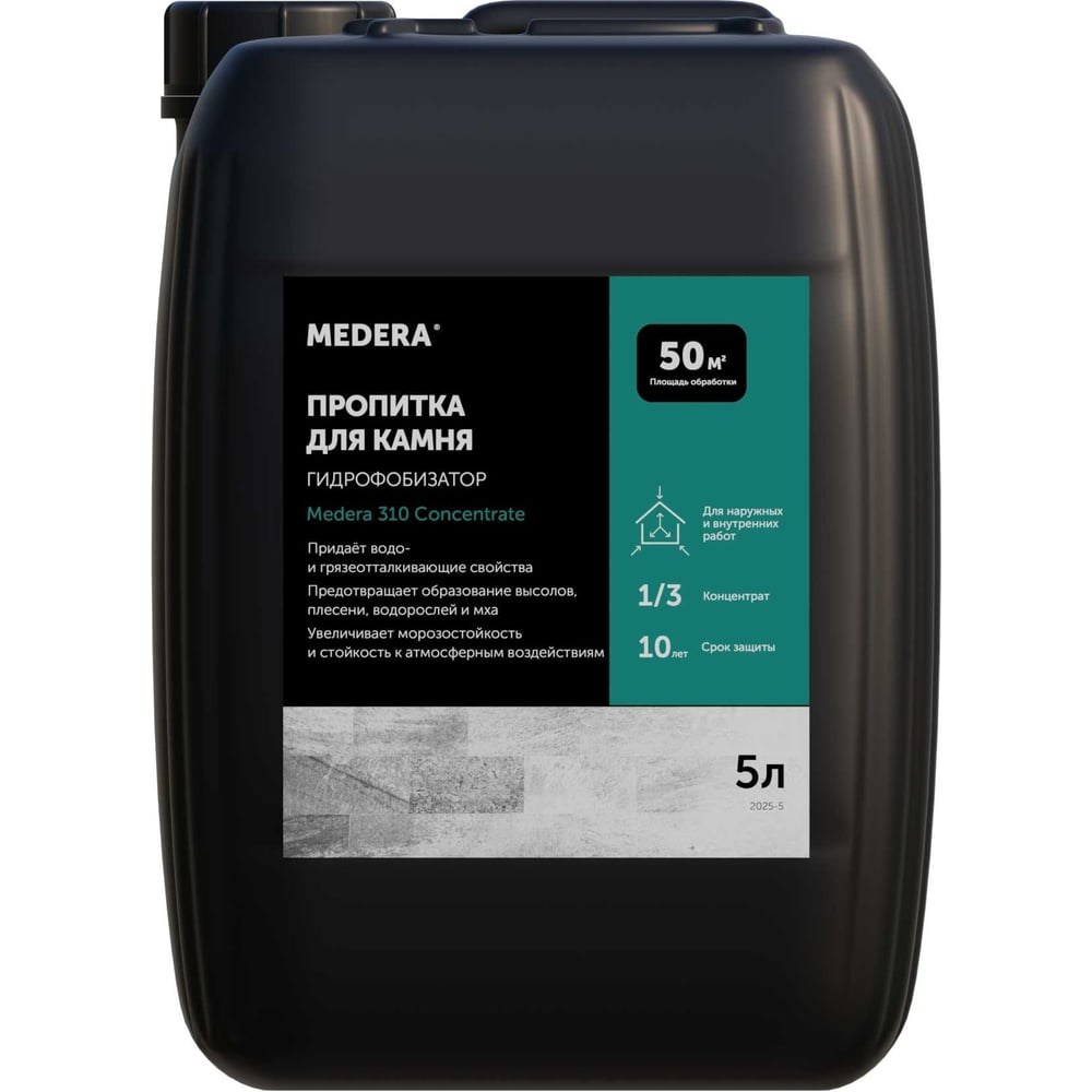 MEDERA 310 Гидрофобизатор-пропитка для камня, для наружных и внутренних работ, концентрат 1/3Рекомендуется для защиты минеральных материалов от воздействия влаги и уличных загрязнений на срок ≥10 летПрименима как снижающая водопоглощение и увеличивающая морозостойкость добавка в затворную воду при производстве бетонов и тротуарной плитки, для штукатурных смесей.Свойства:После высыхания придаёт водо- и грязеотталкивающие свойства поверхностям из кирпича, бетона и газобетона, шифера, камня, др. минеральных материалов, существенно увеличивая срок их службы. Предотвращает образование высолов, плесени, водорослей и мха. Пожаро- и взрывобезопасный. Возможно образование мелкодисперсного осадка. Замерзает, после размораживания свойства сохраняются.Способ применения:Очистить поверхность от загрязнений (цементных брызг, высолов, пятен биопоражения и др.) и высушить! Разбавить из расчёта 1:3 (1л+2л воды=3л раствора). Нанести на поверхность кистью (валиком, разбрызгивателем). Рекомендуется наносить 2 раза (второй слой наносить на ещё влажный первый). Норма расхода раствора на 1м² при двукратной обработке: 300мл для известняка, песчаника, искусственного камня, кирпича и др.; 400мл для минеральной штукатурки; 500мл для газобетона и пористого бетона. Перед нанесением ЛКМ и клеев на водной основе использовать адгезионные грунтовки.Предупреждающие меры:Применять строго по назначению указанными способами. При работе использовать резиновые перчатки, защитные очки/маску и спецодежду.
